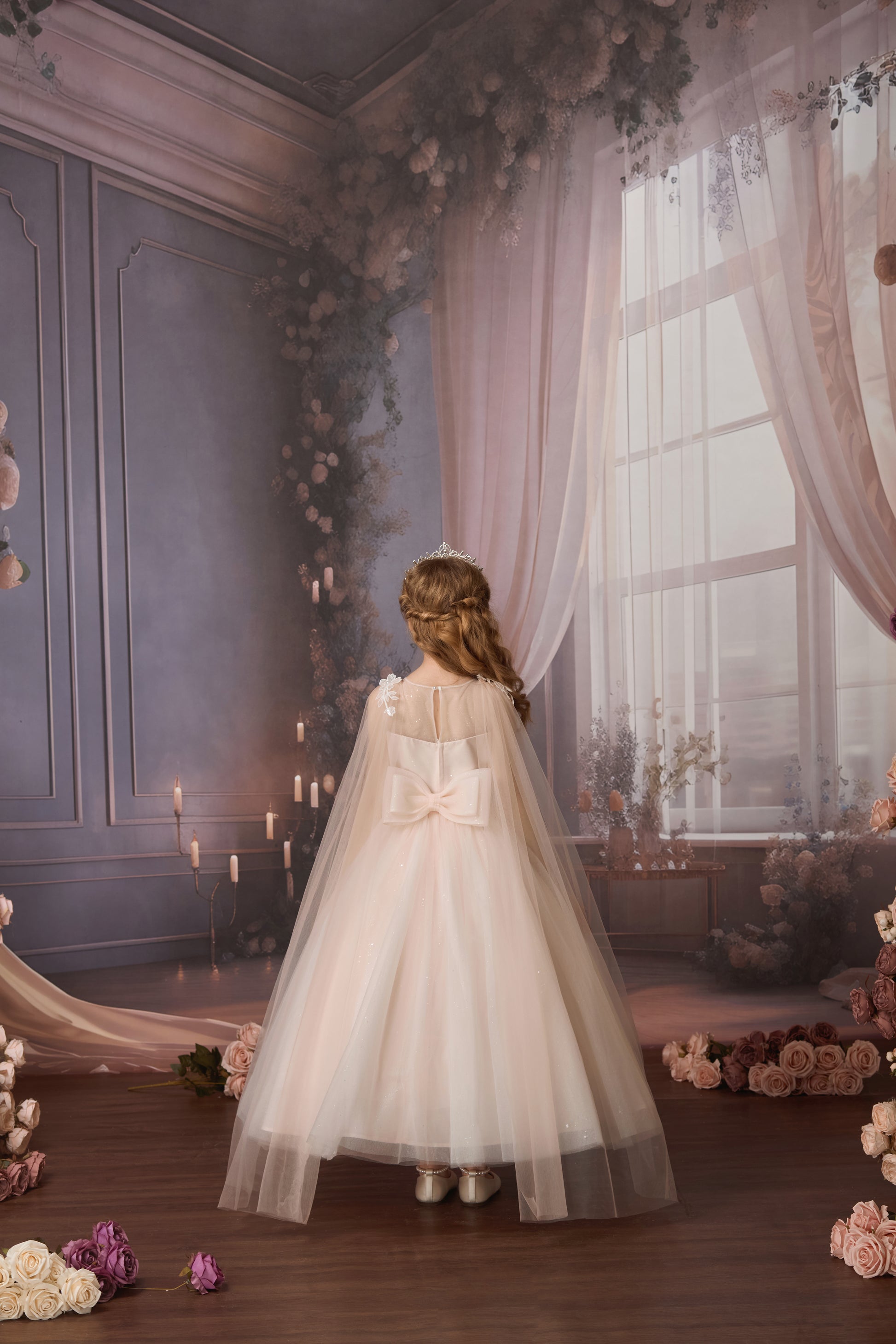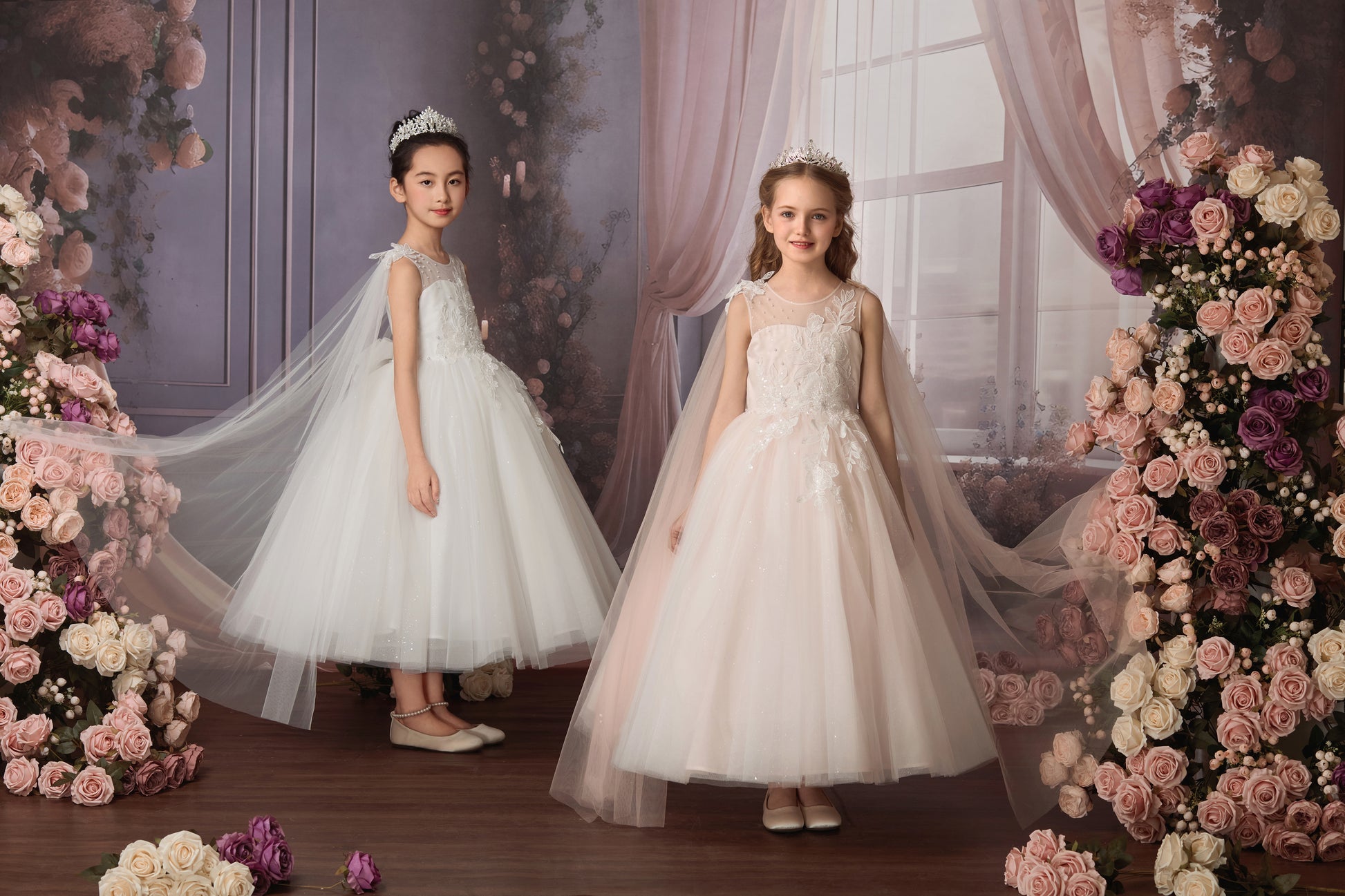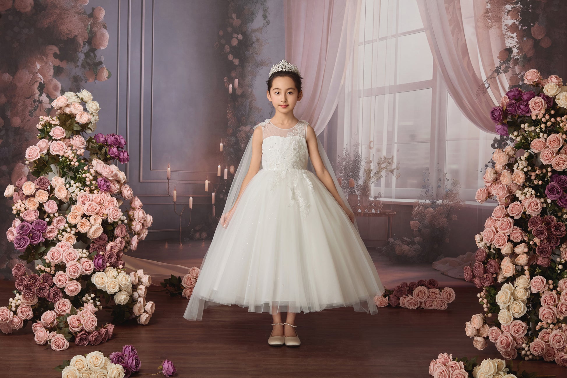 This exquisite white tulle dress perfectly blends fantasy and luxury for little princesses. The skirt is made of multiple layers of soft, sheer tulle, with an ethereal lightness that evokes a magical, fairy-like charm.
