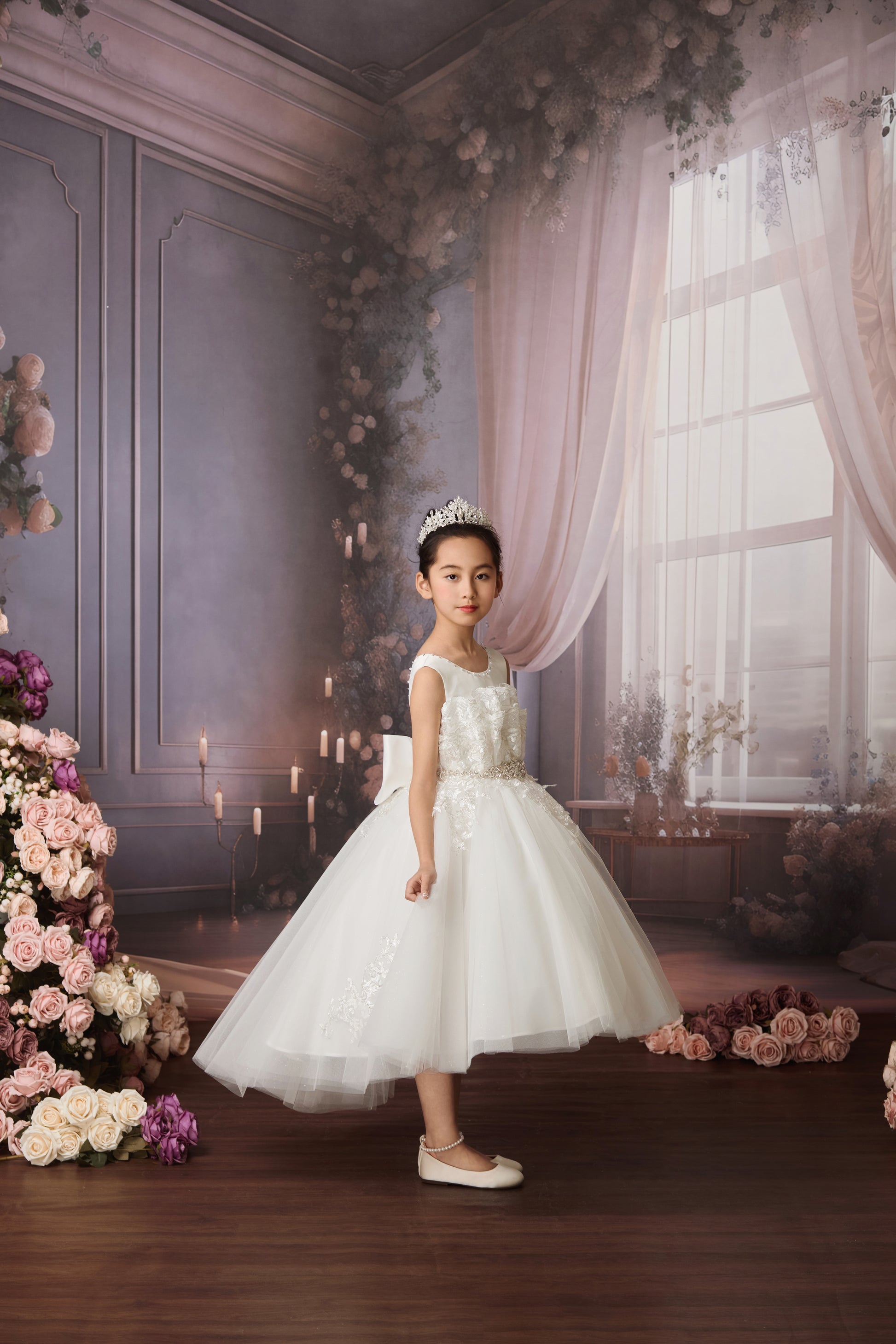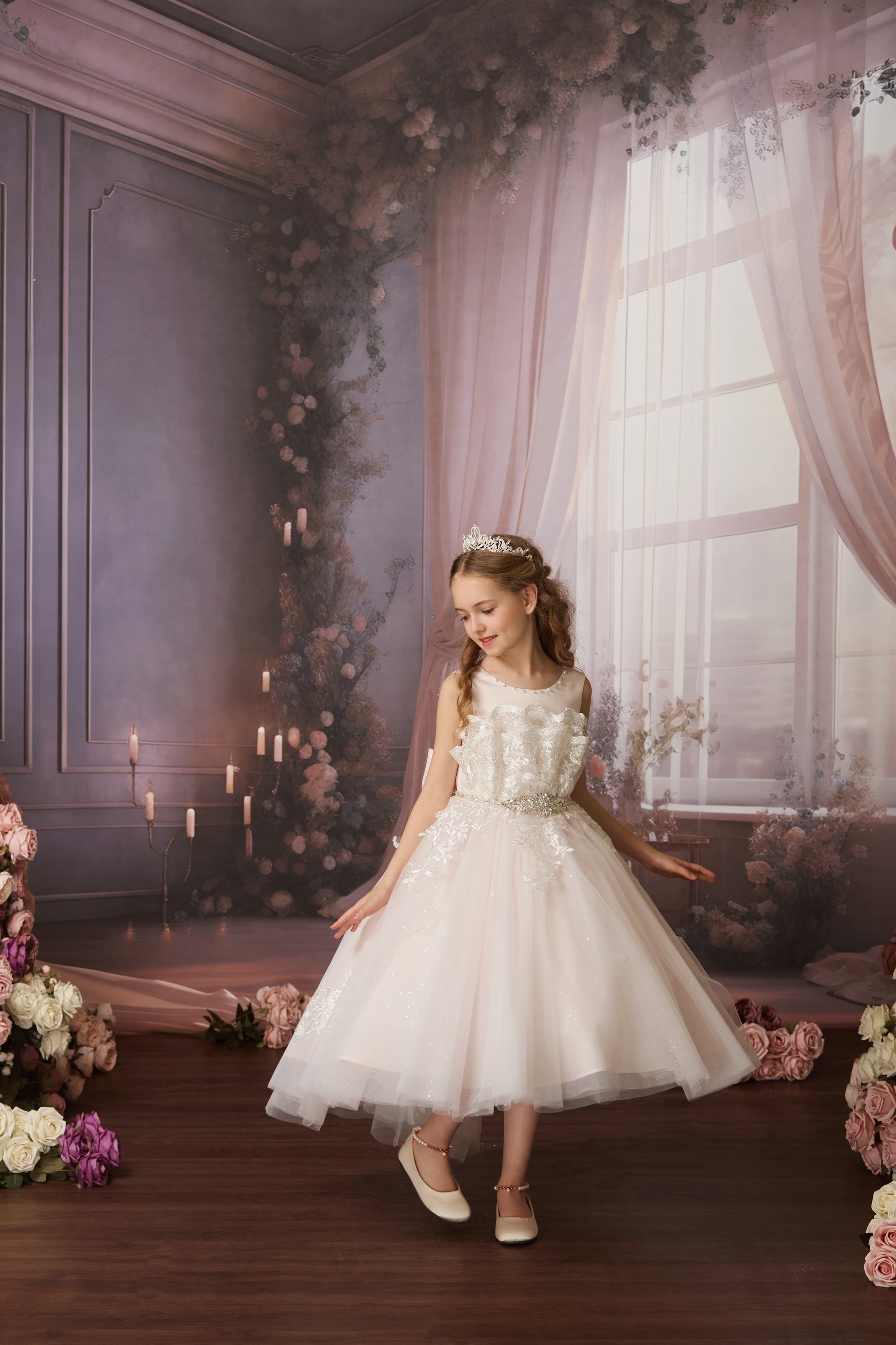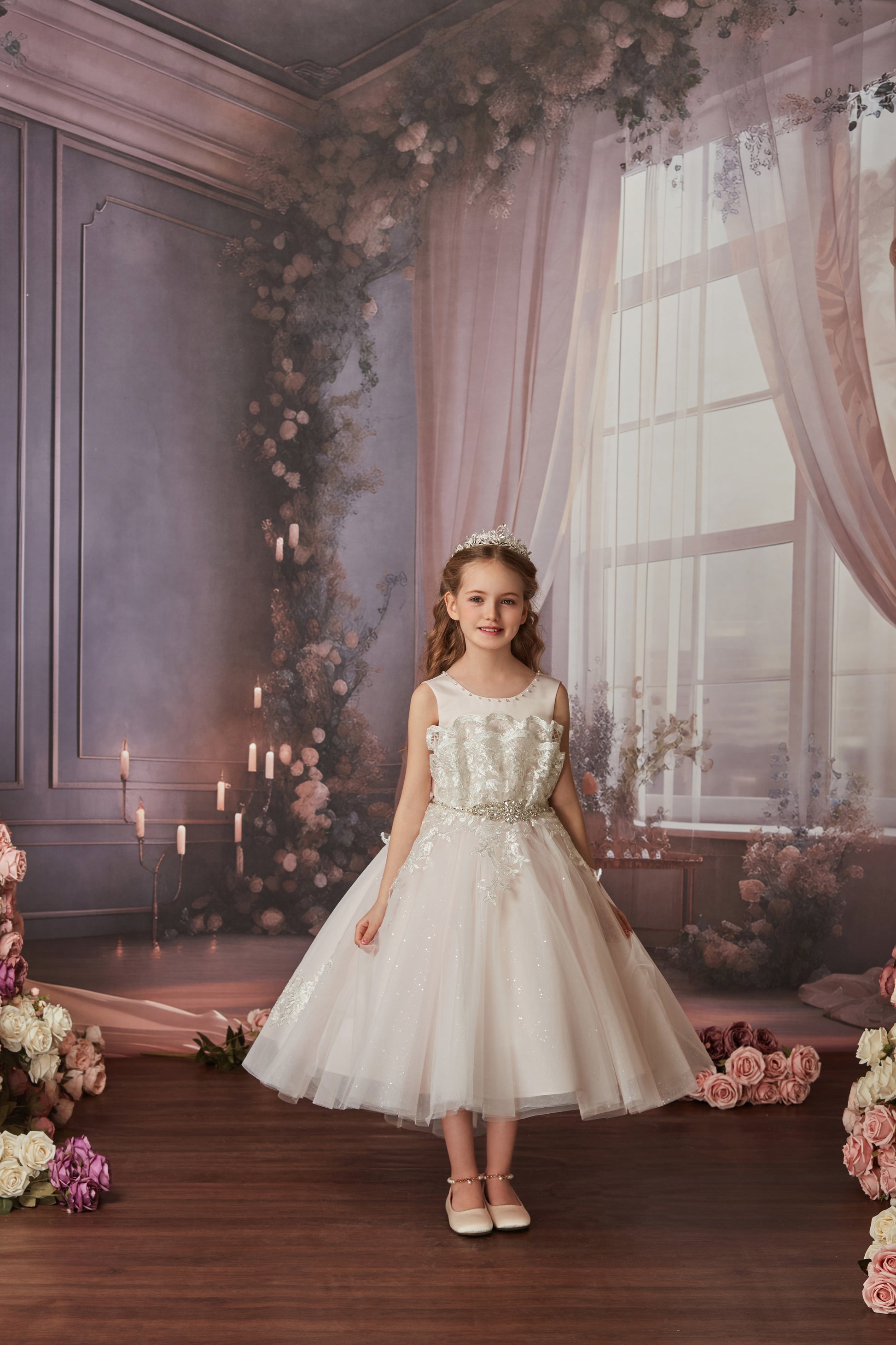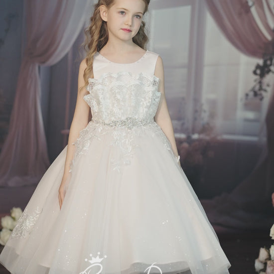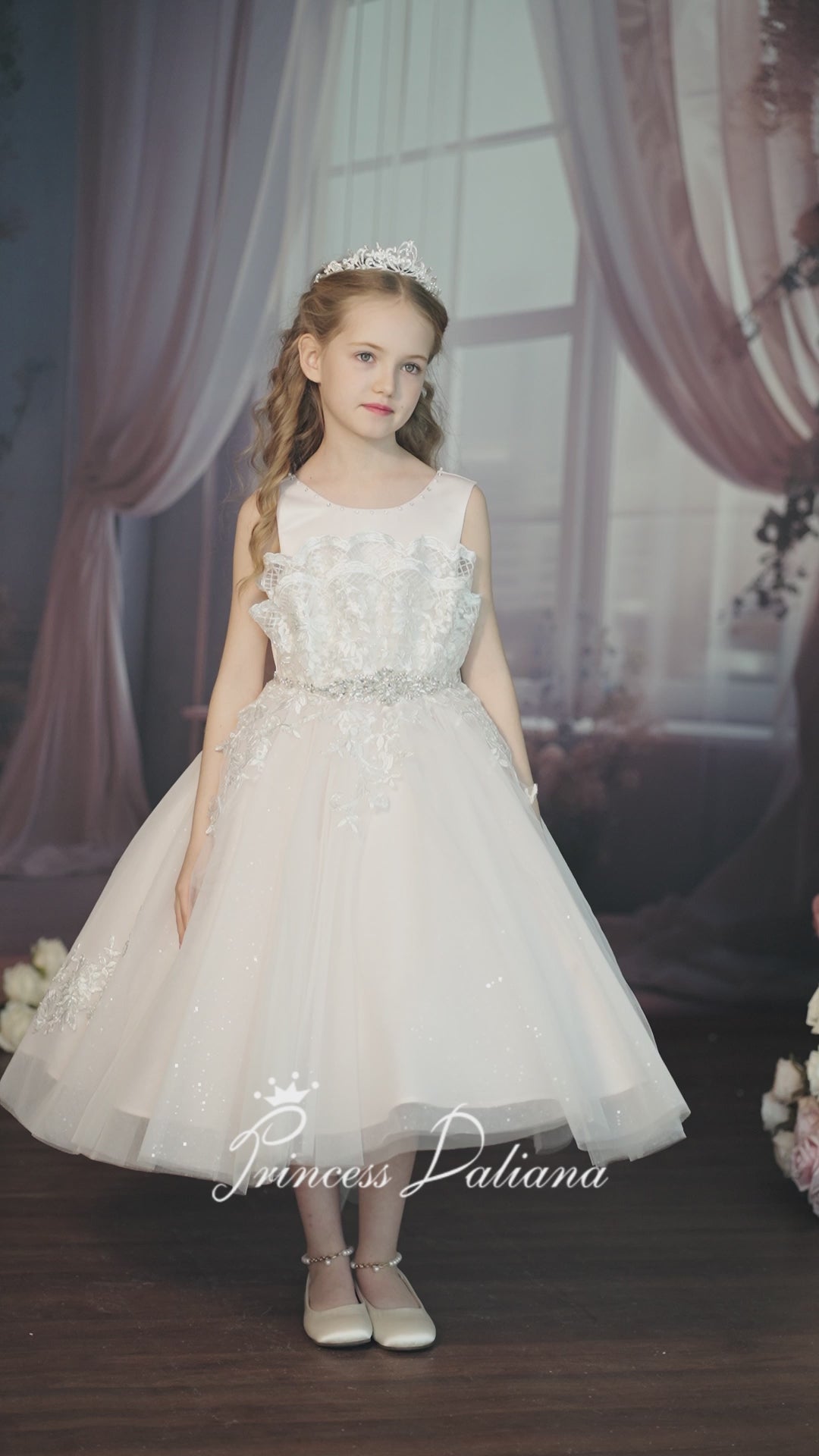The skirt is crafted from multiple layers of soft, airy tulle, including subtle layers of glitter-embedded tulle that catch the light with a delicate sparkle with every movement. The overall effect is ethereal and lightweight, evoking the enchanting image of a little forest fairy—radiating royal elegance and translucent grace.