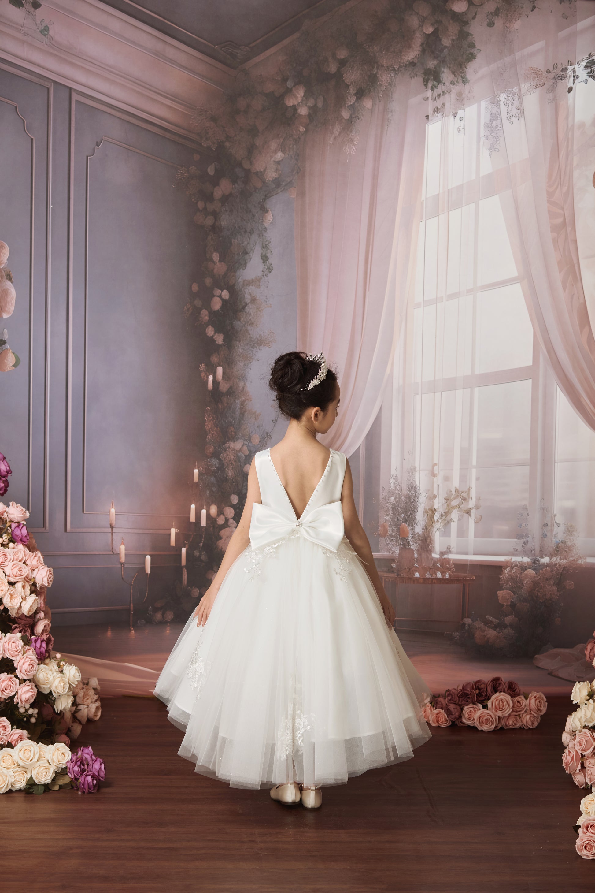 This elegant white dress exudes a fairy-tale charm, combining a satin bodice with a tulle skirt for a perfect blend of sophistication and fantasy. The sleek satin top is adorned with two tiers of silver-boned lace, meticulously gathered into delicate fan-shaped designs that extend to the waist, adding a luxurious and dimensional detail.