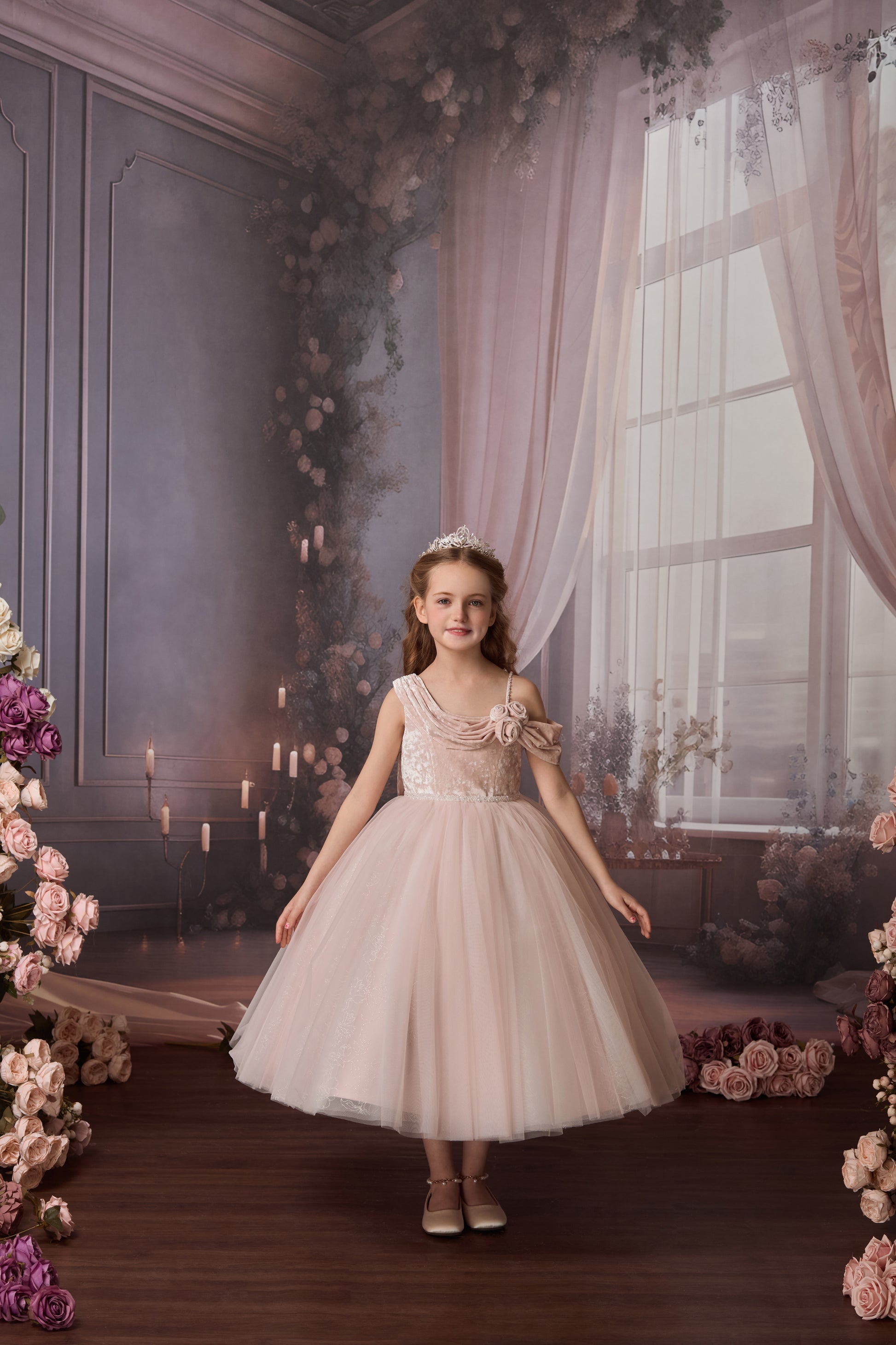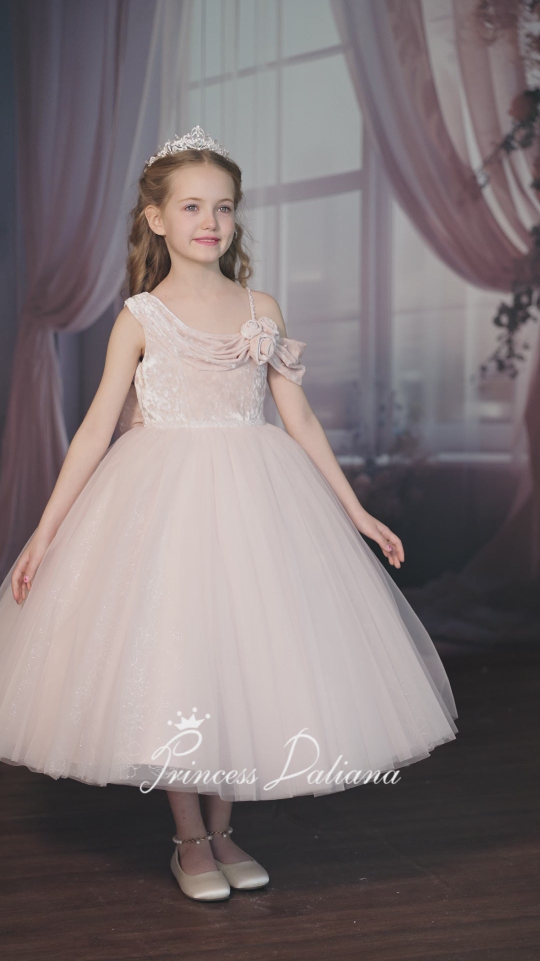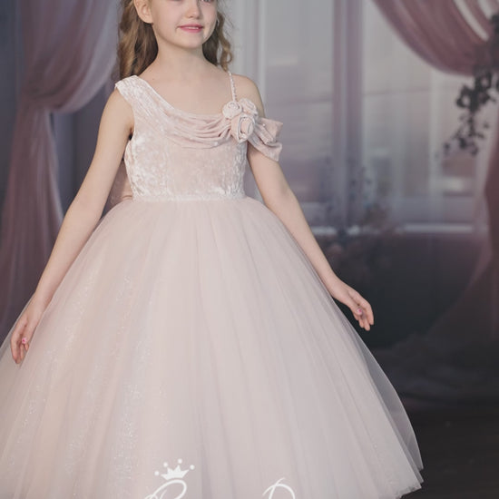 This exquisite white gown masterfully blends luxurious velvet and dreamy tulle to create a look of royal fantasy. The bodice, crafted from plush velvet, features an elegant asymmetrical design with a wide strap on one shoulder and a delicate slim strap on the other. A gracefully gathered velvet drape sweeps across the chest, connecting to a beautifully handcrafted velvet rose at the shoulder and elegantly wrapping around one arm, showcasing artisanal detail and sophistication.