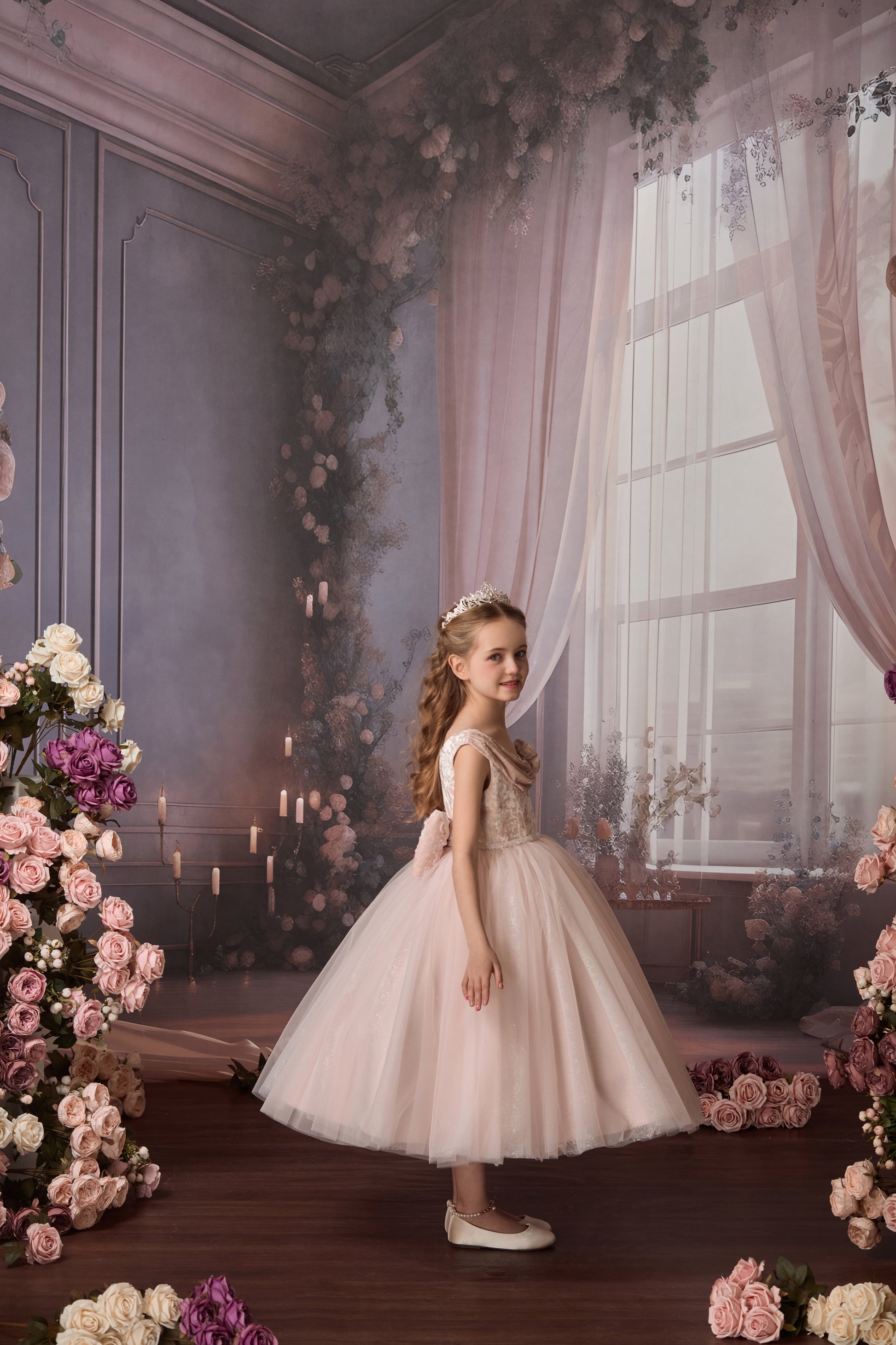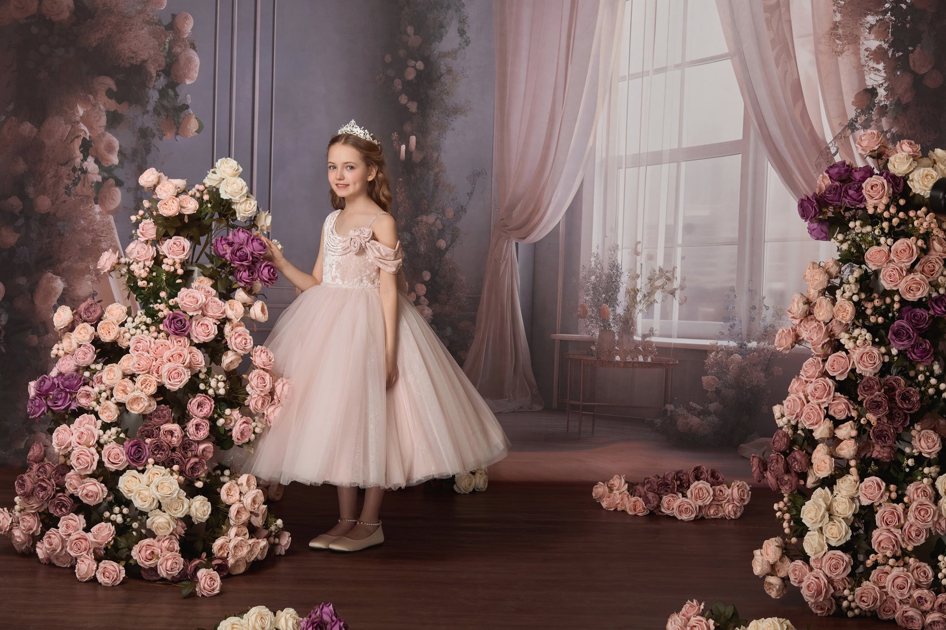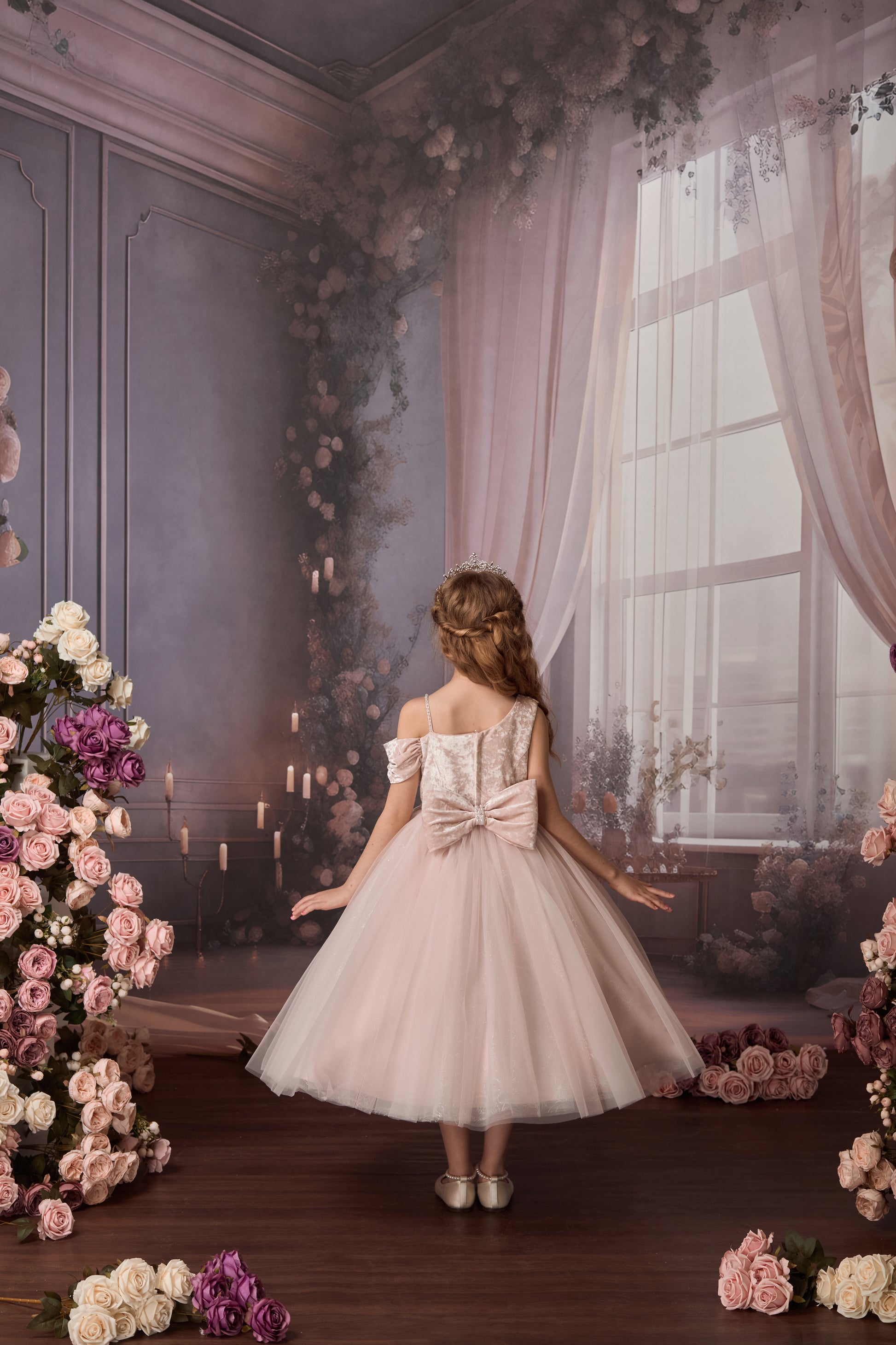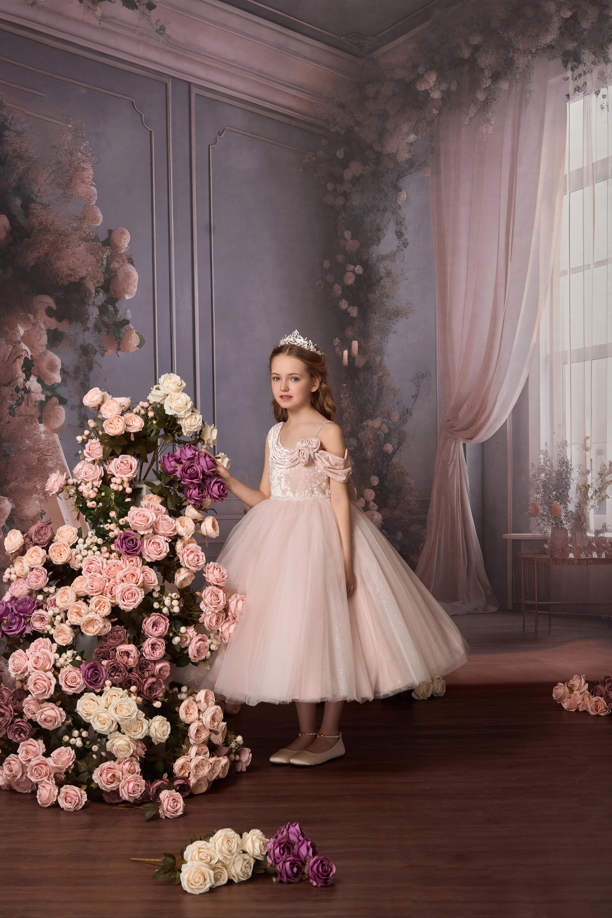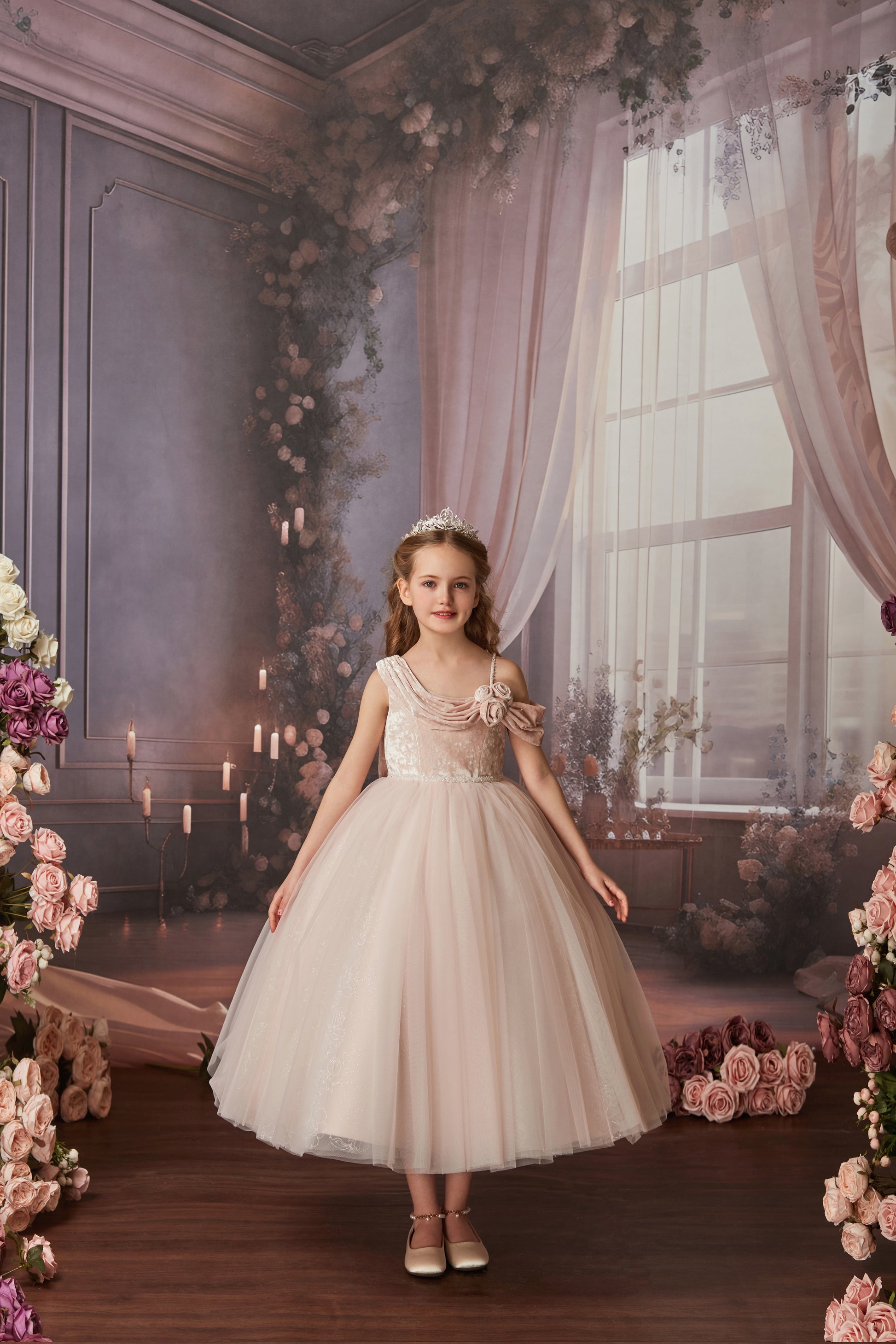 The skirt is composed of multiple layers of soft, airy tulle, including sparkling glitter-embedded layers that shimmer subtly with every movement. Voluminous yet lightweight, the design captures a sense of enchantment and elegance, making the wearer resemble a delicate fairy-tale sprite—perfectly balancing opulent charm with ethereal grace.
