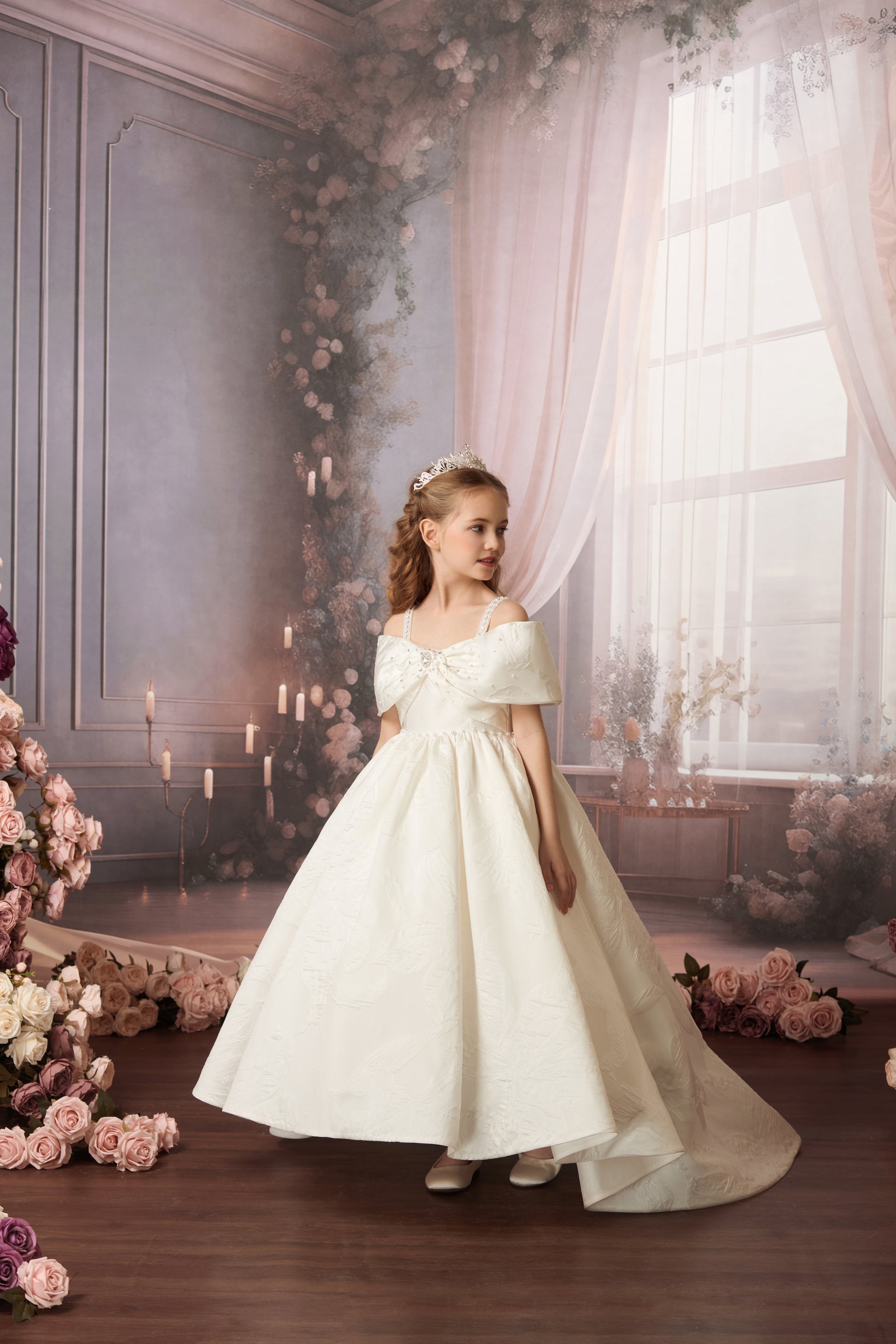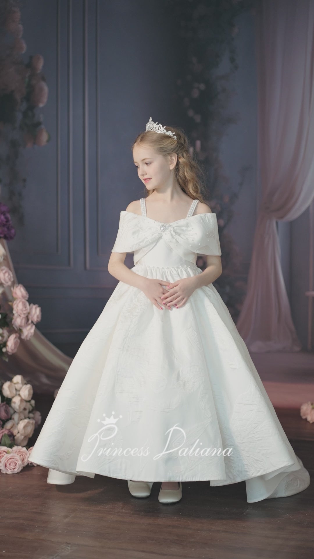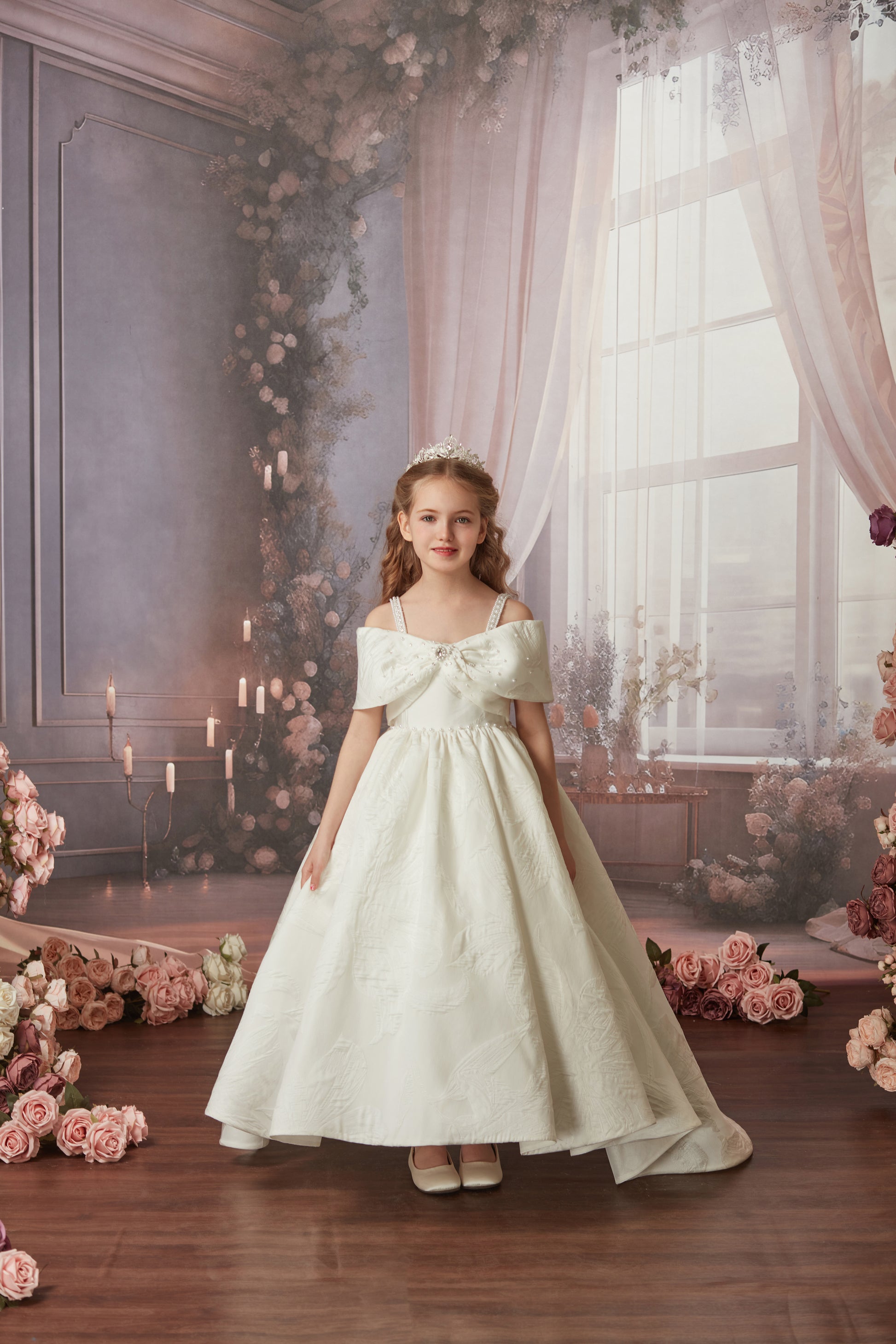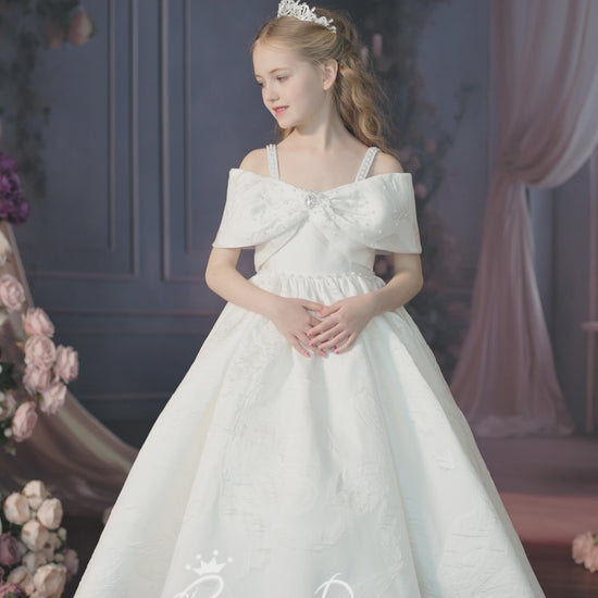 This majestic flower girl dress is fit for a princess from a storybook, crafted entirely from ornate jacquard satin. Utilizing expert three-dimensional draping, the design sculpts a flawless and elegant silhouette. The most striking feature is the oversized bow crafted from the same jacquard, which artfully drapes over the shoulders and frames the chest, adding a touch of exquisite and romantic.