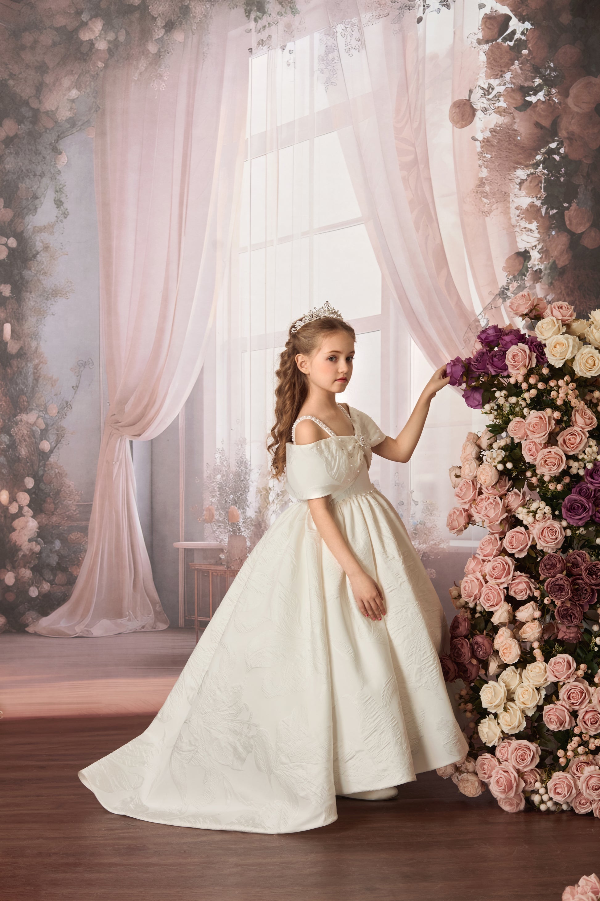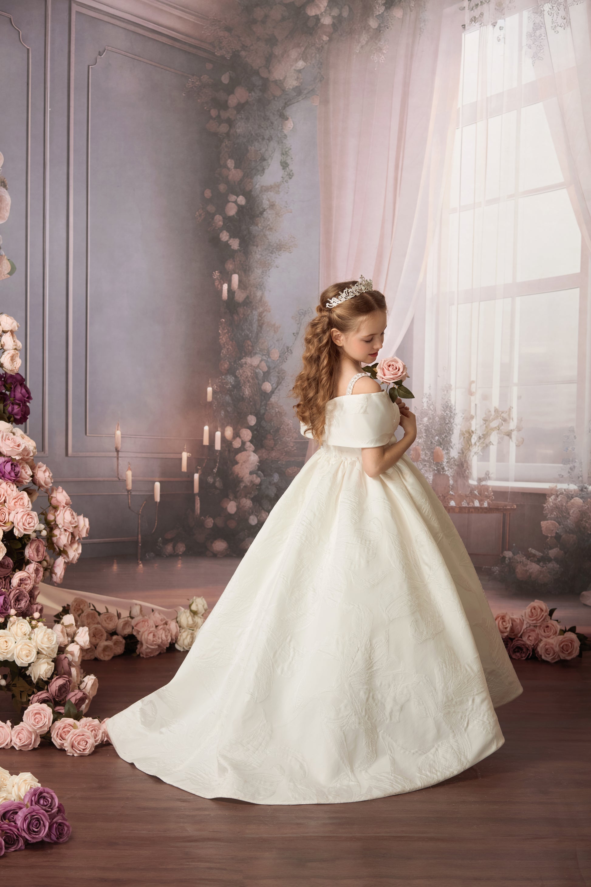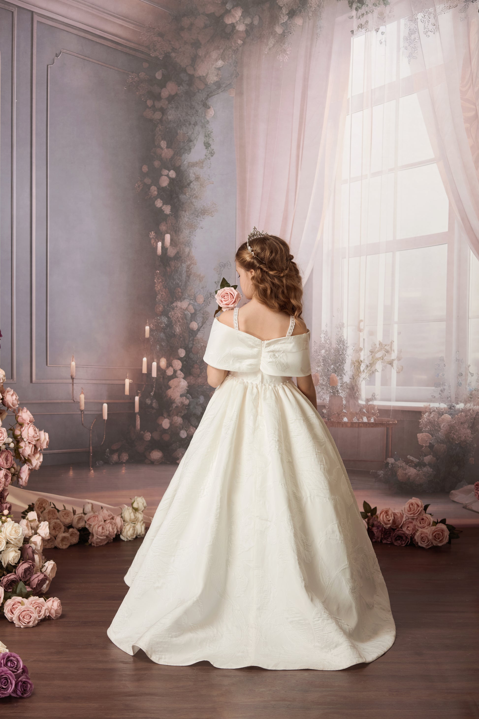 This majestic flower girl dress is fit for a princess from a storybook, crafted entirely from ornate jacquard satin. Utilizing expert three-dimensional draping, the design sculpts a flawless and elegant silhouette. The most striking feature is the oversized bow crafted from the same jacquard, which artfully drapes over the shoulders and frames the chest, adding a touch of exquisite and romantic.