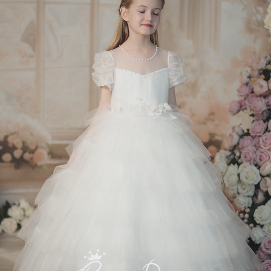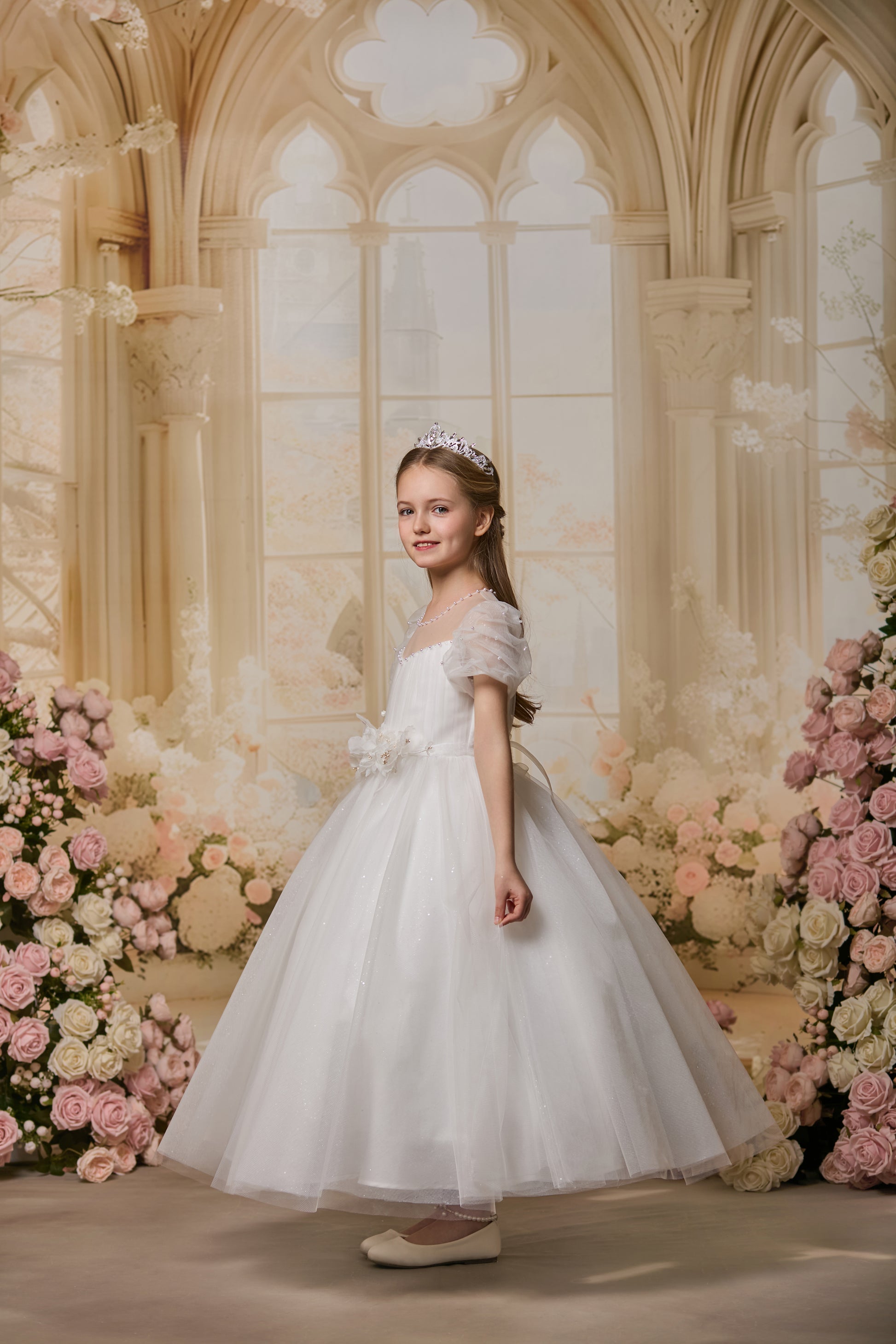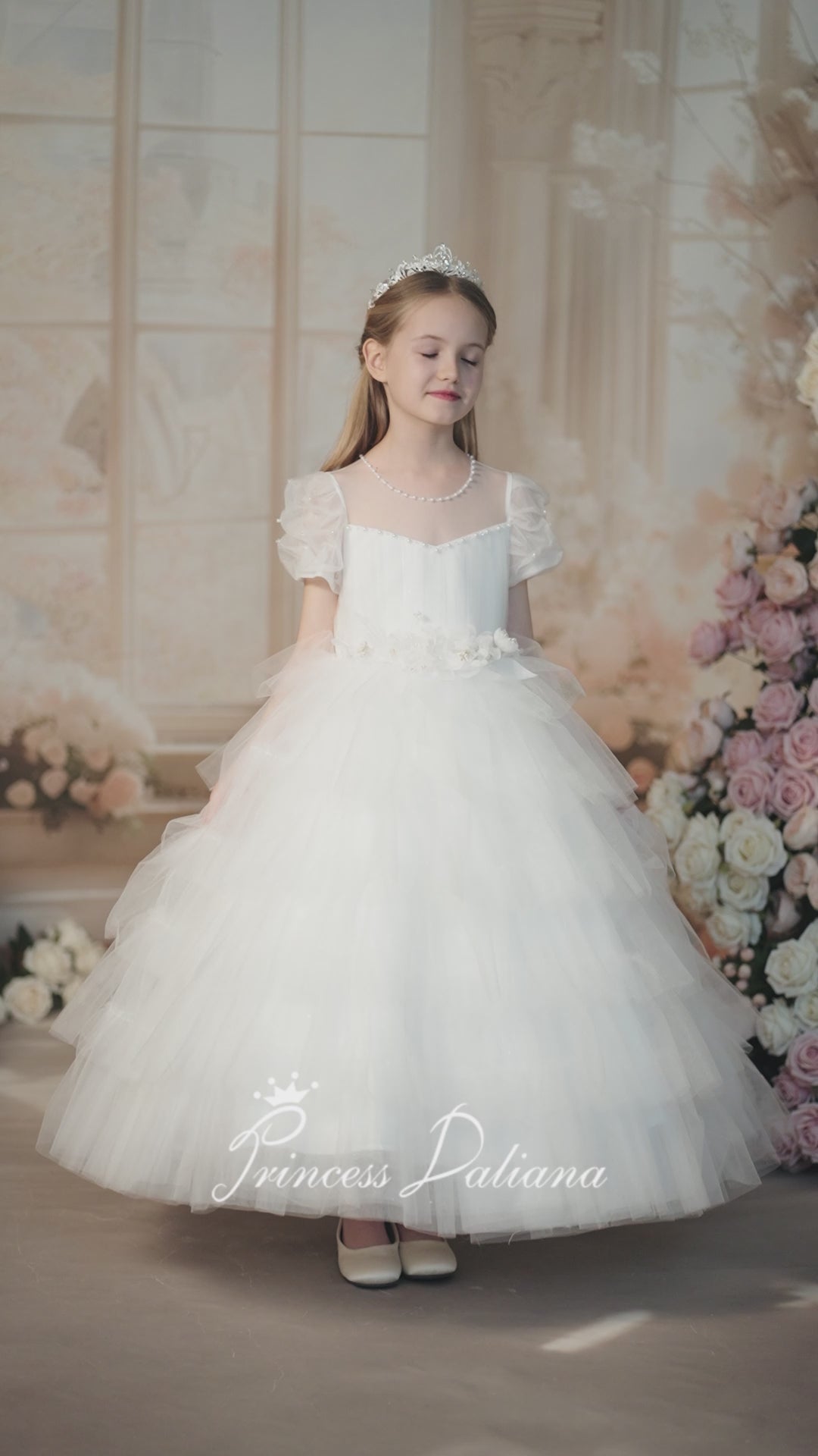 This white gown reinterprets modern princess style with innovative design and dreamlike materials. The bodice combines lustrous satin with sheer tulle, featuring delicate tulle gathering techniques that create a soft, translucent effect. The princess puff sleeves are adorned with gathered tulle and rhinestone accents, sparkling with refined elegance.