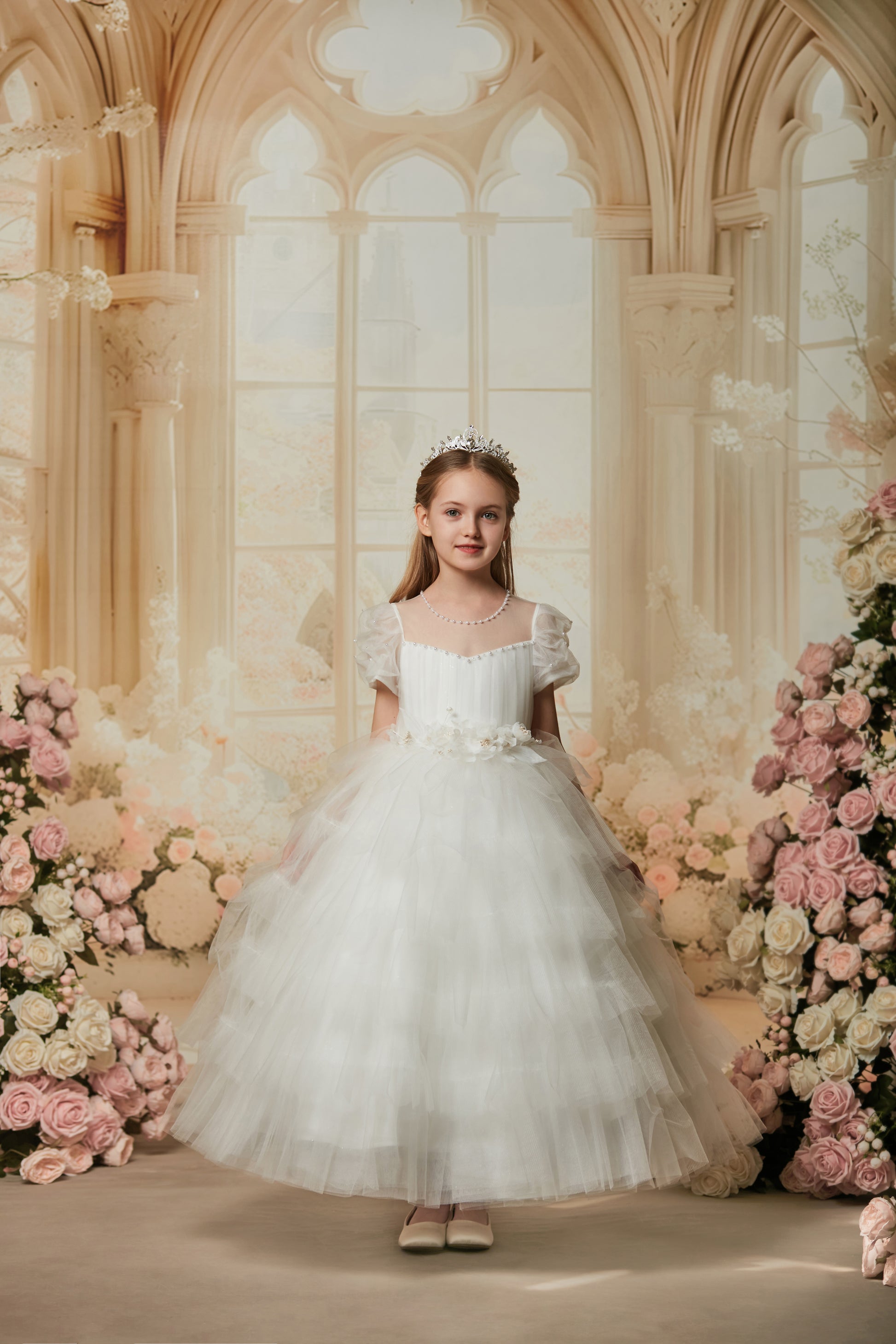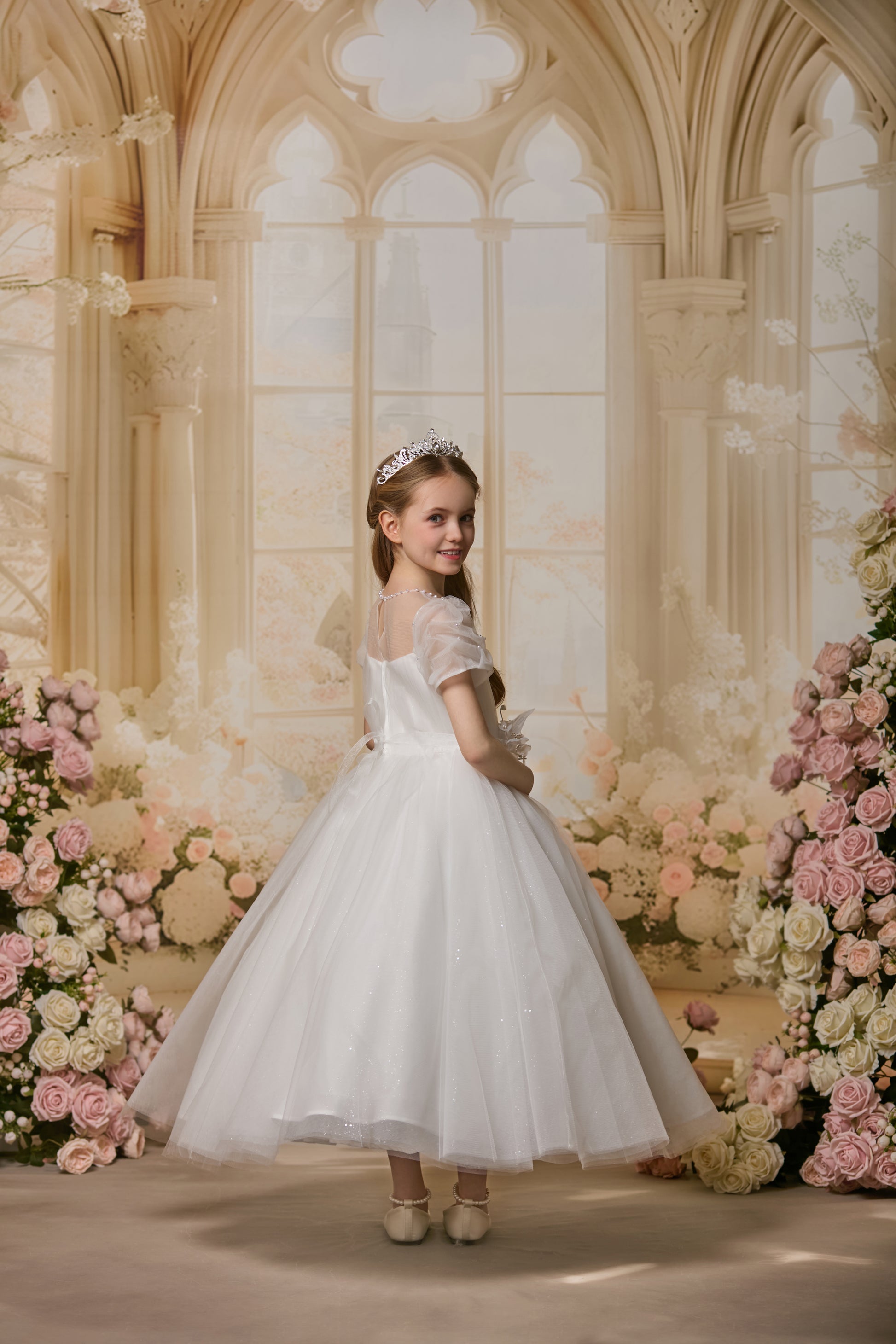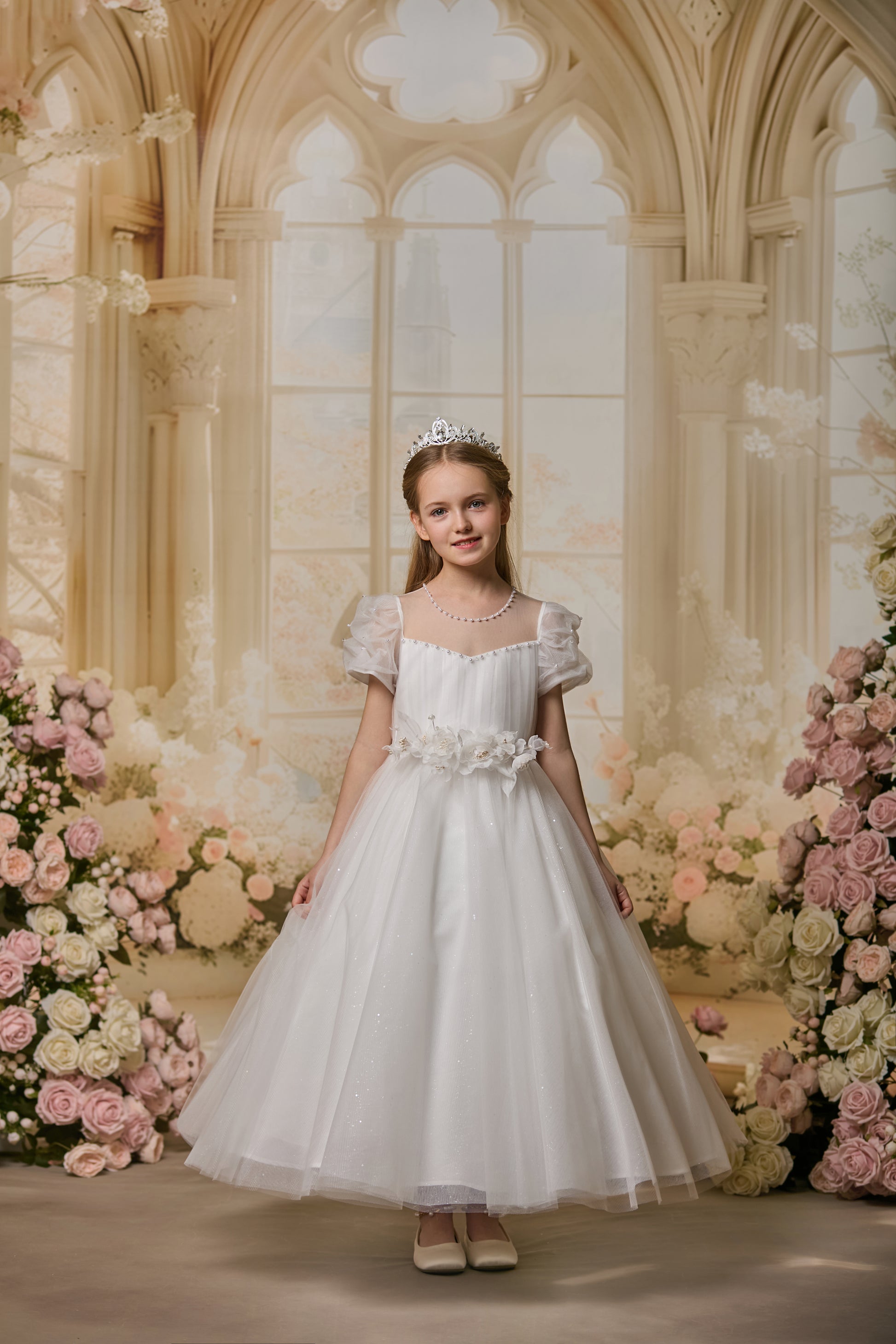 This white gown reinterprets modern princess style with innovative design and dreamlike materials. The bodice combines lustrous satin with sheer tulle, featuring delicate tulle gathering techniques that create a soft, translucent effect. The princess puff sleeves are adorned with gathered tulle and rhinestone accents, sparkling with refined elegance.