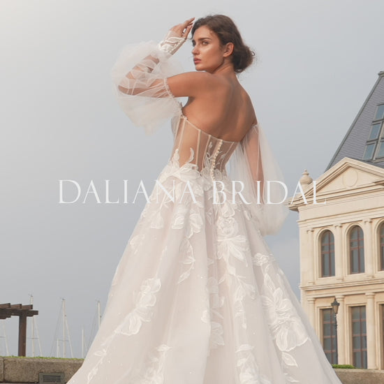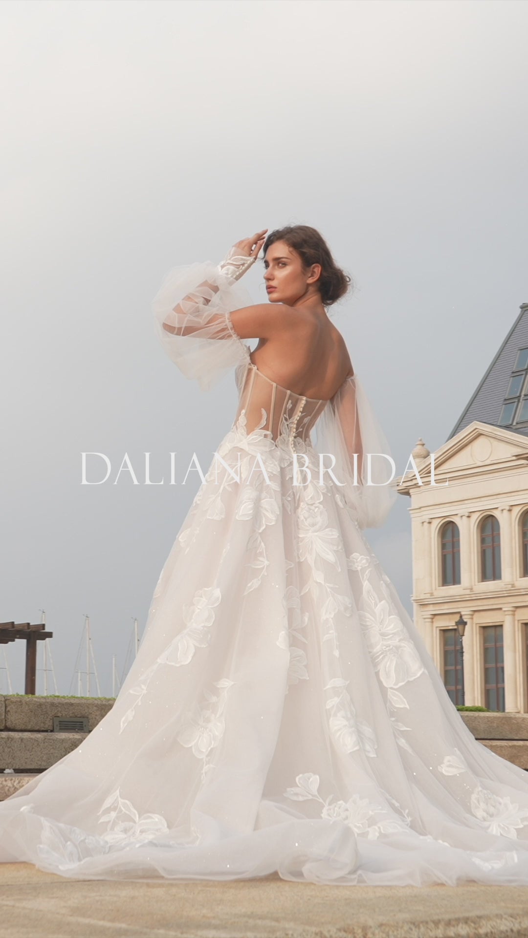 "Regal Floral Lace Gown with Statement Sleeves"This dress makes you look and feel like royalty! Bold lace flowers create stunning texture, while the corset waist and voluminous sleeves give you that perfect mix of power and femininity.