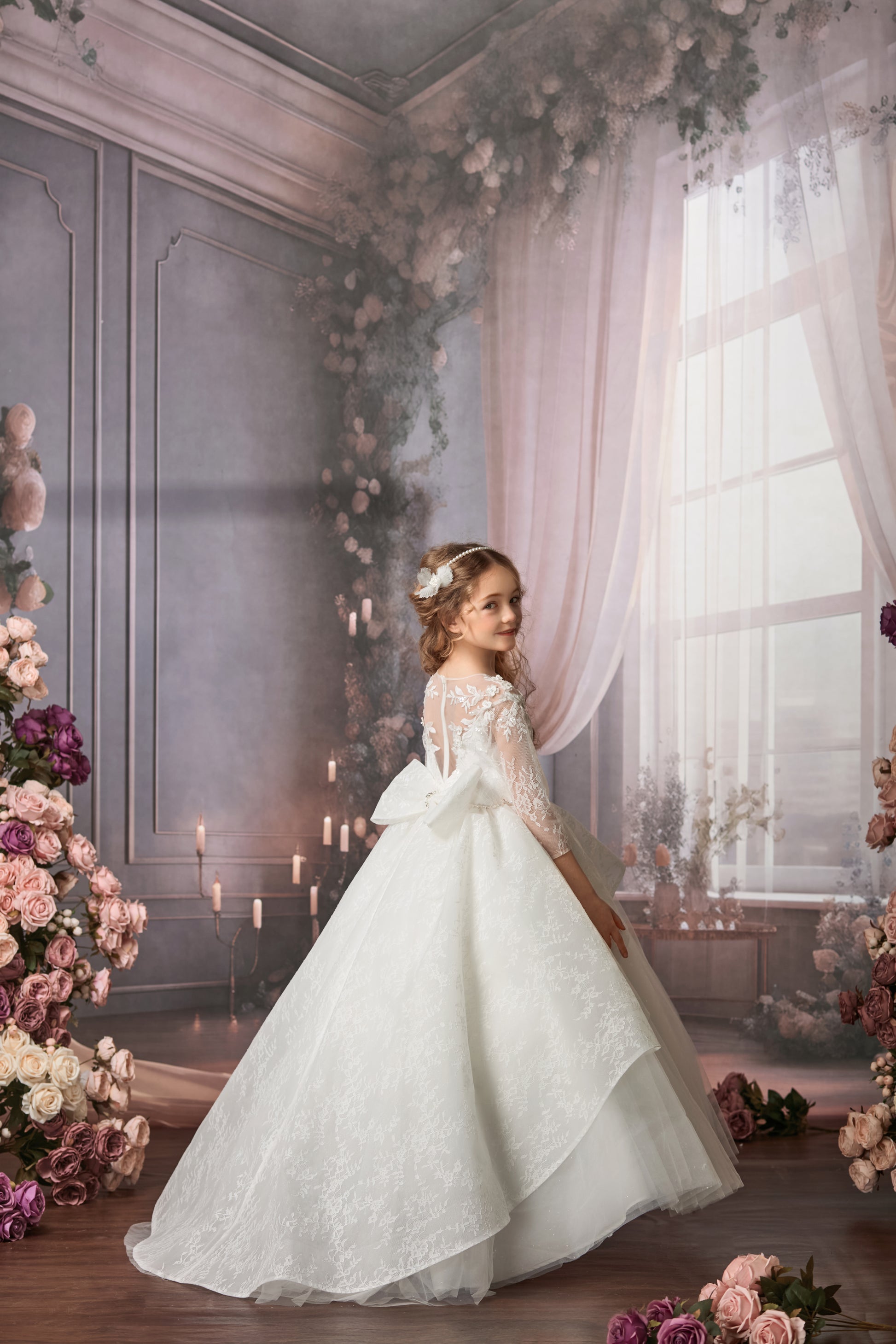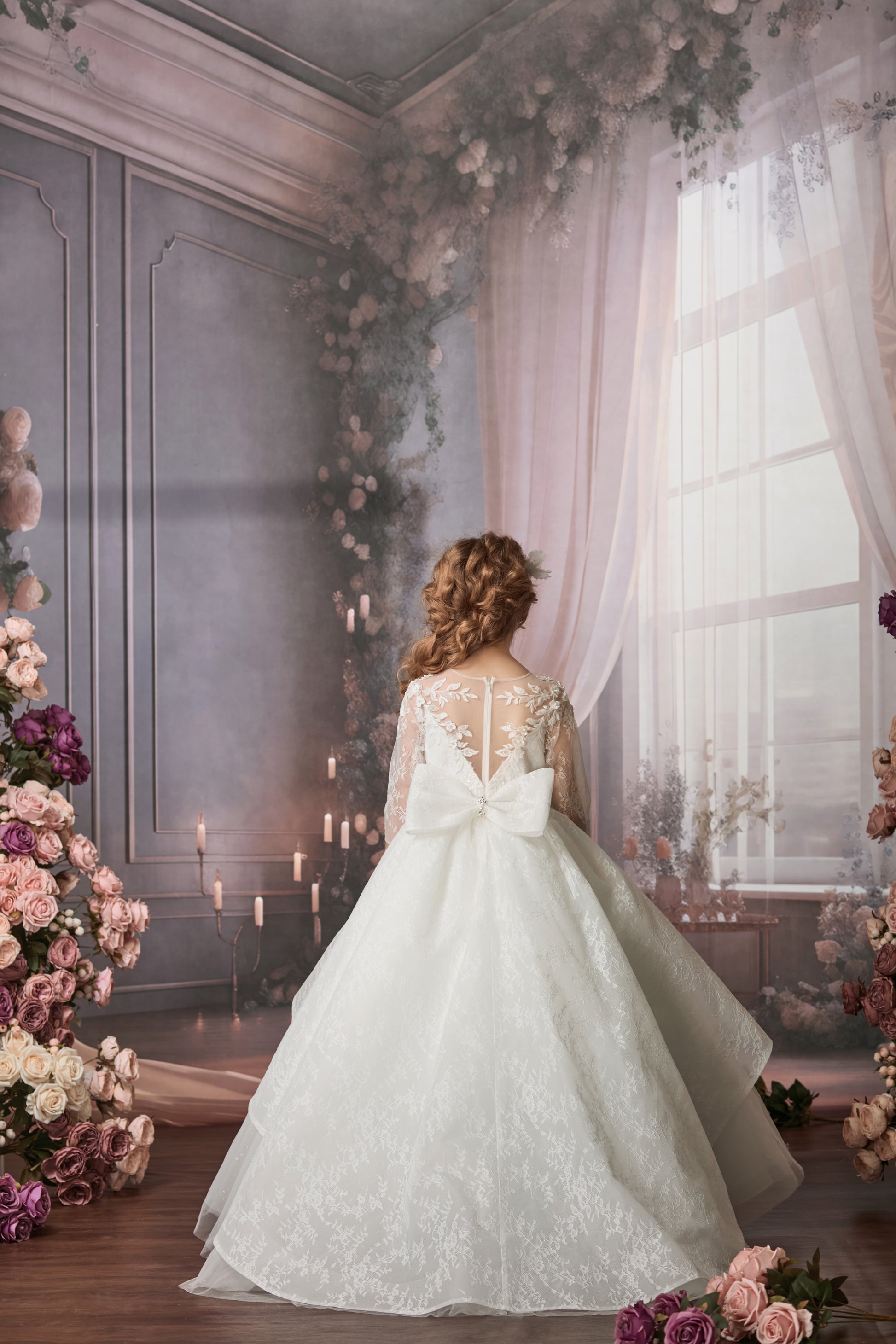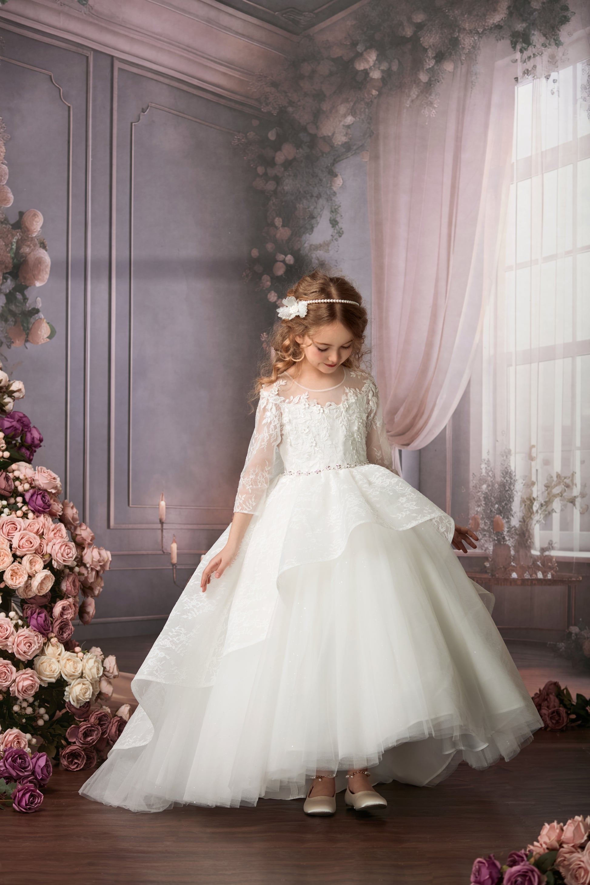 This white gown showcases exquisite craftsmanship with its innovative composite fabrics, creating a dreamy princess silhouette. The bodice combines delicate lace with sheer tulle, featuring long sleeves adorned with intricate lace appliqués that trace the curves of the arms, offering both elegance and a flattering fit.