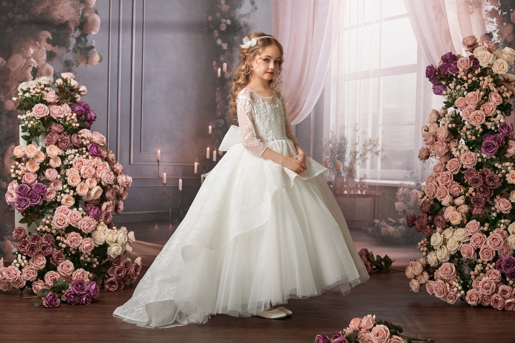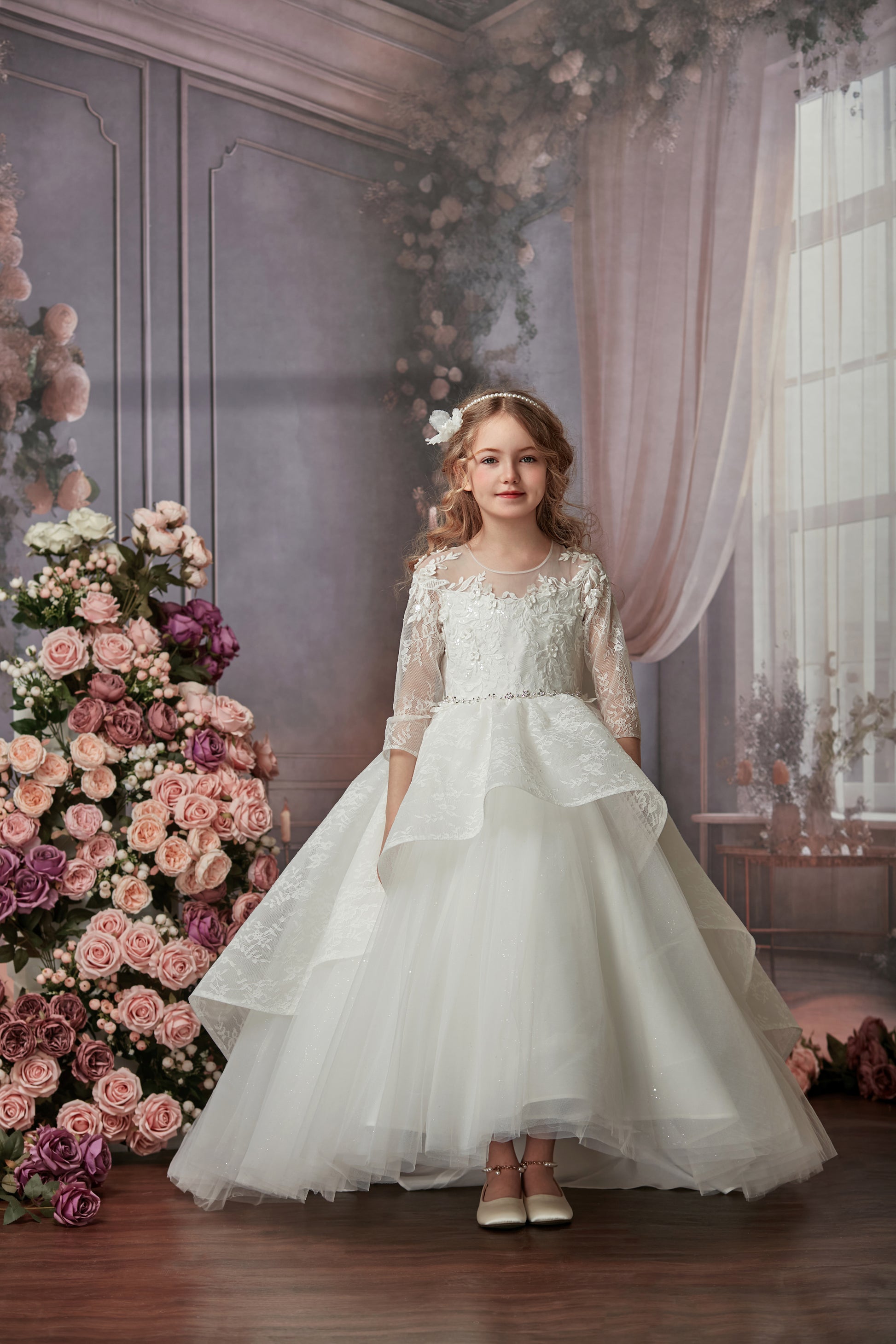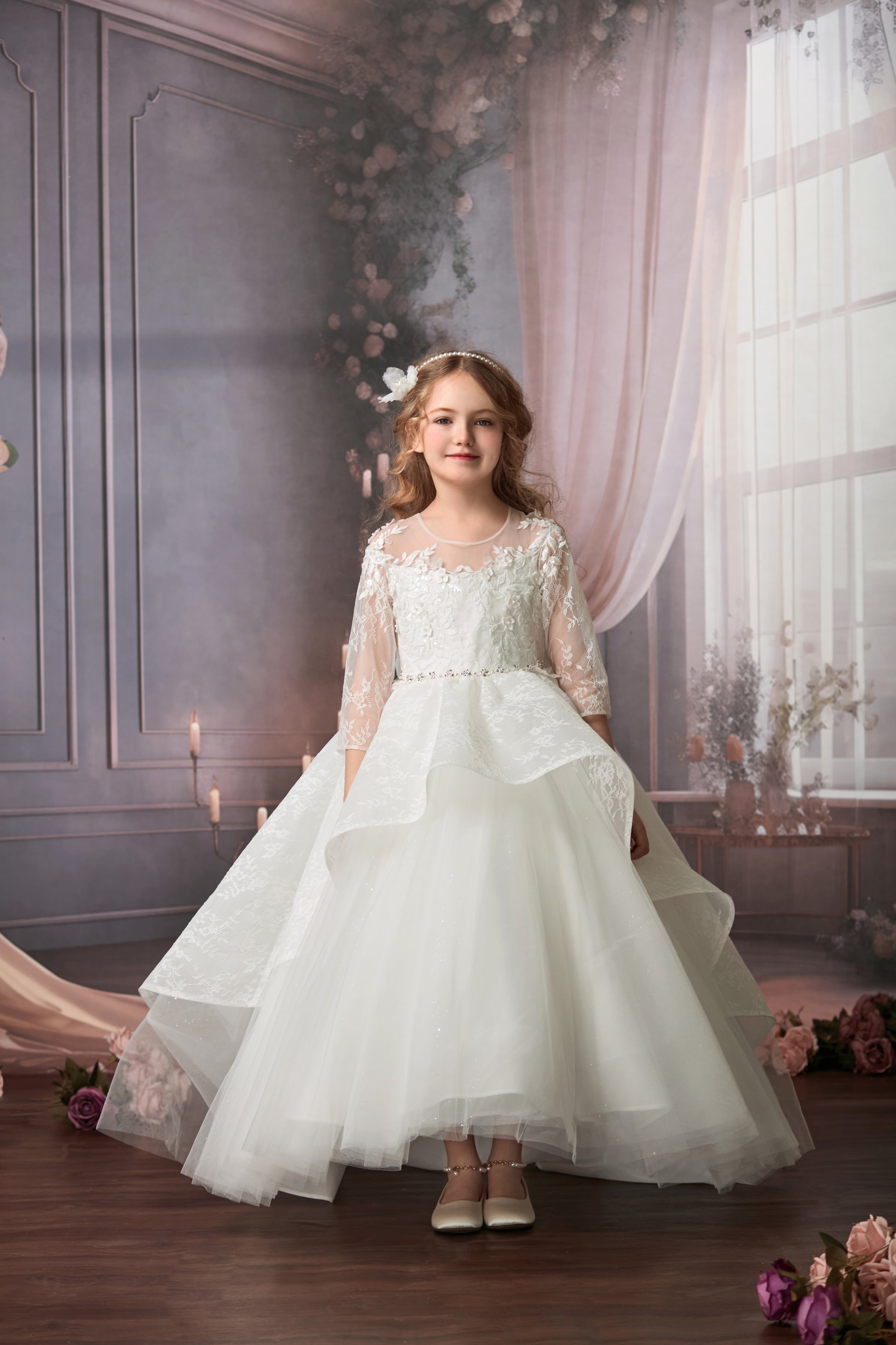 This white gown showcases exquisite craftsmanship with its innovative composite fabrics, creating a dreamy princess silhouette. The bodice combines delicate lace with sheer tulle, featuring long sleeves adorned with intricate lace appliqués that trace the curves of the arms, offering both elegance and a flattering fit.