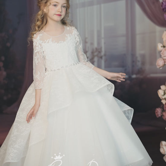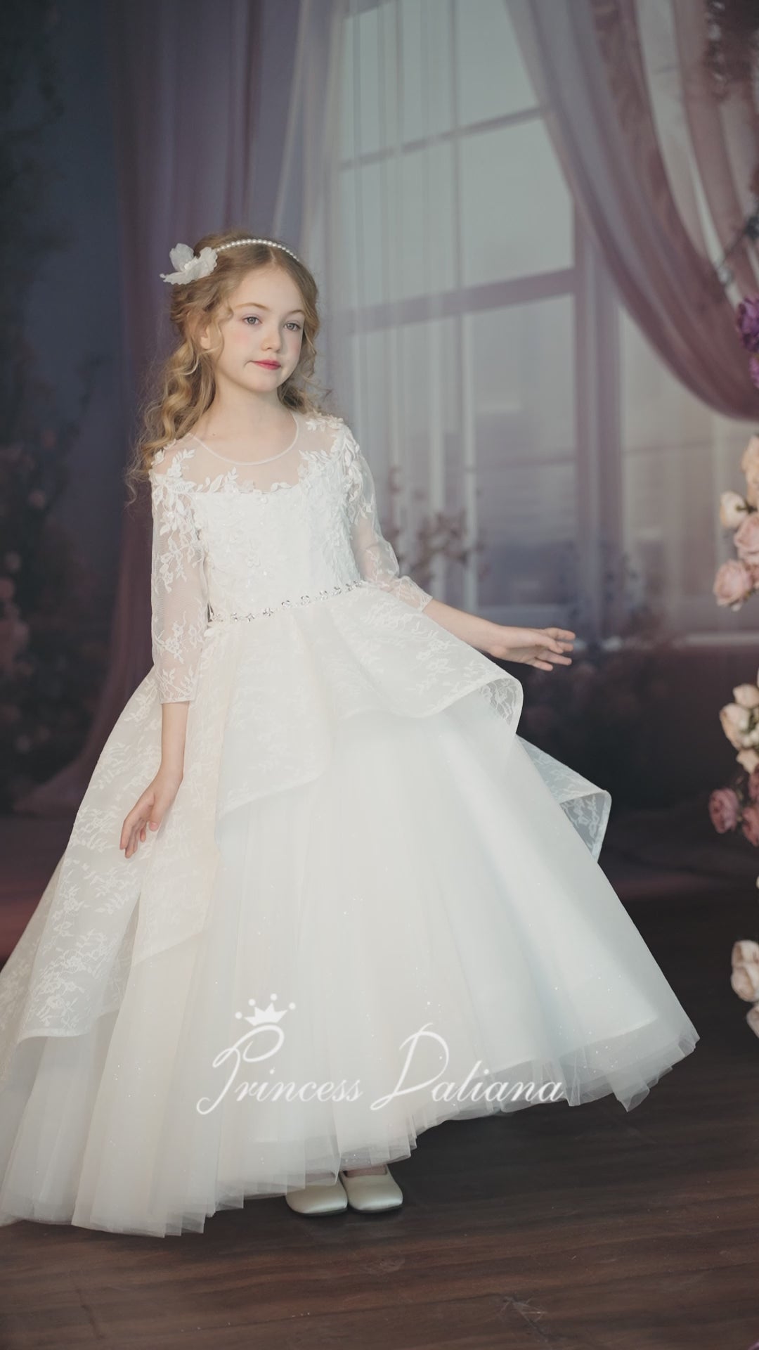 The skirt is crafted from organza layered over soft lace, meticulously pleated into a wave-like hemline with a shorter front and a dramatic sweep at the back, evoking the grace of ocean waves. Hidden within the skirt, layers of glitter-embedded lace tulle add a subtle sparkle with every movement. Voluminous yet lightweight, the multi-layered tulle creates an ethereal, translucent effect, blending opulent charm with a fairy-tale grace—perfect for a modern princess.