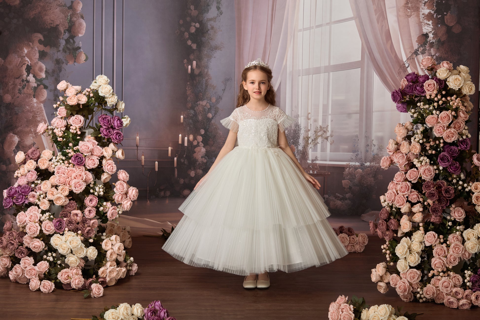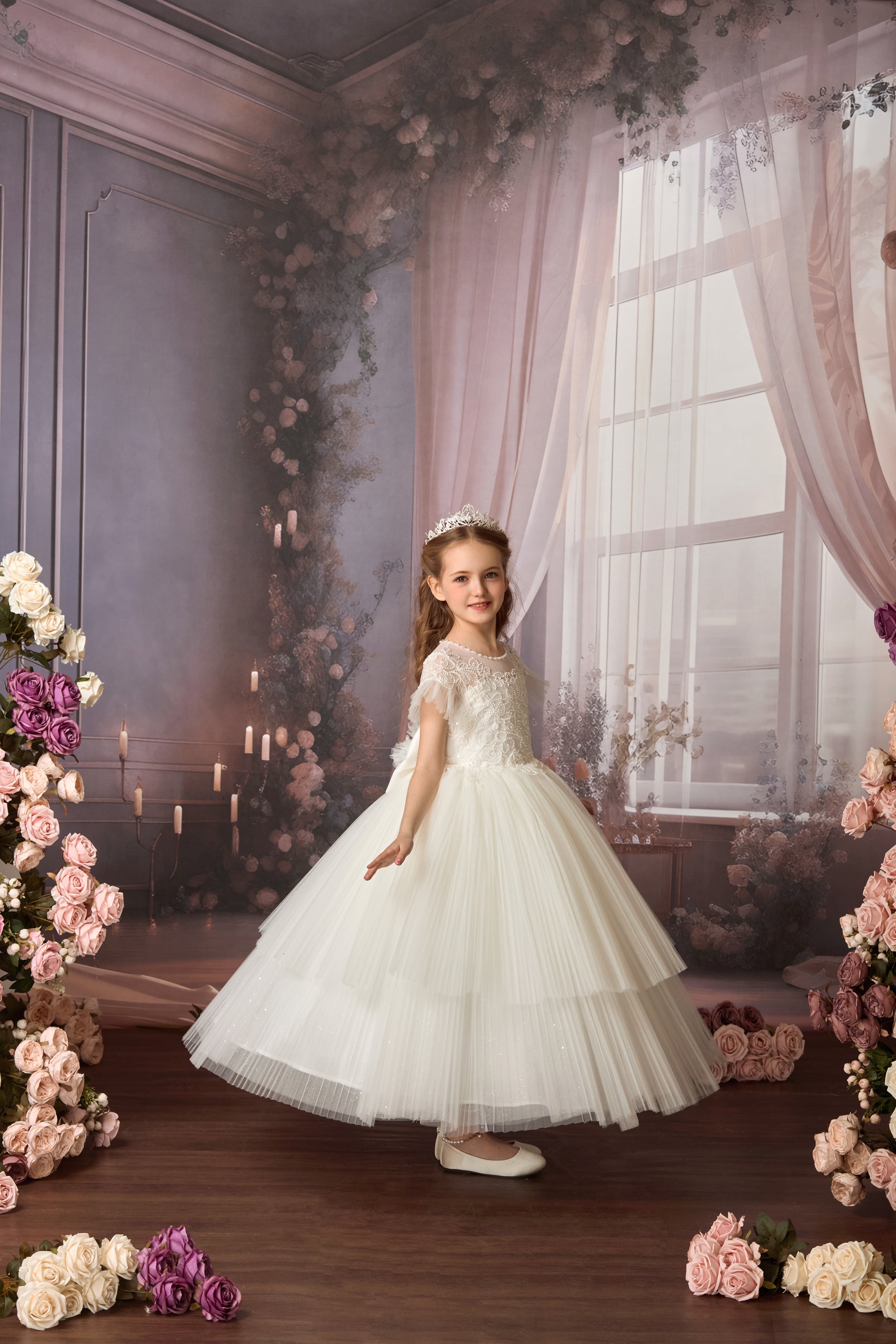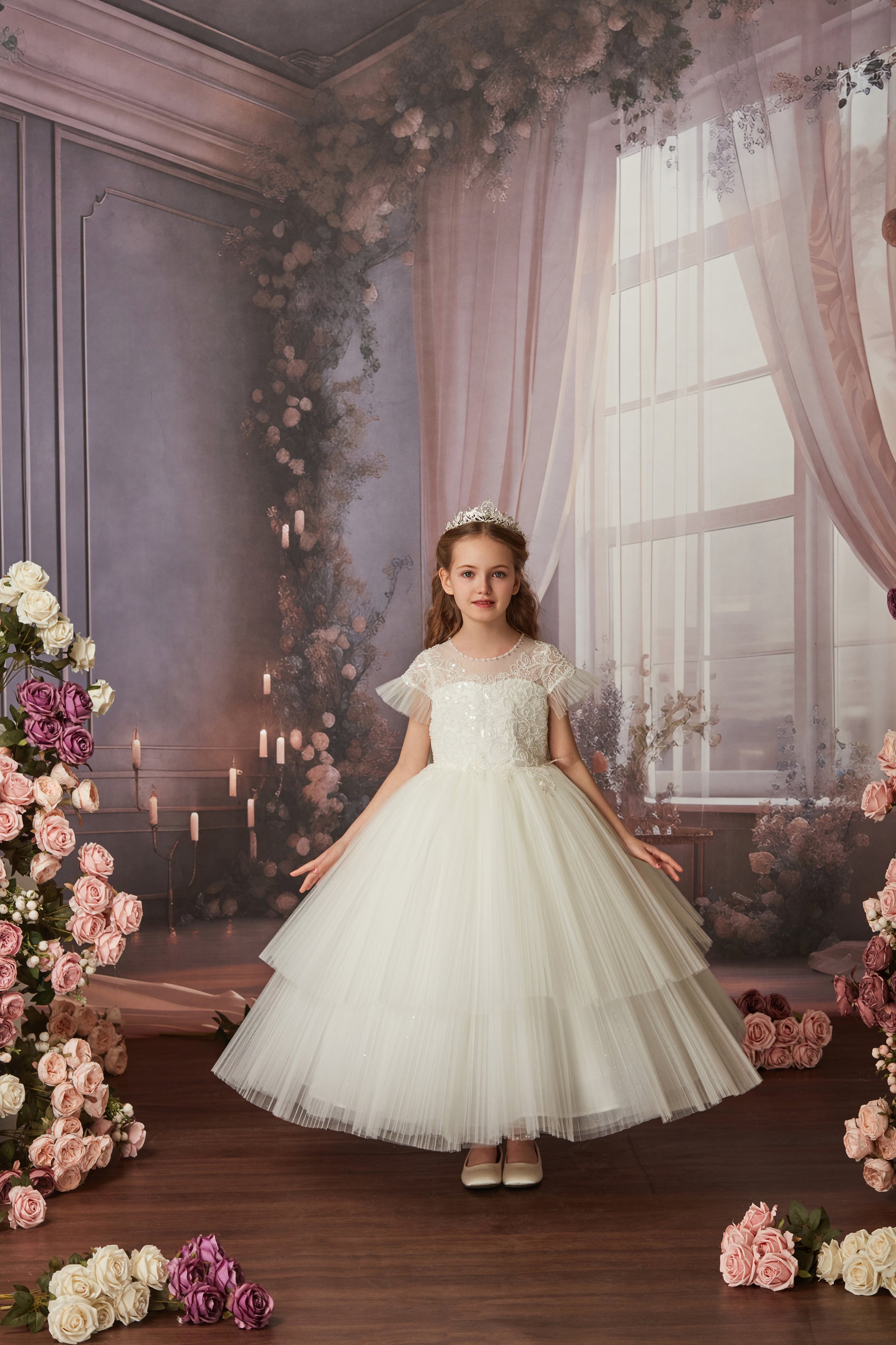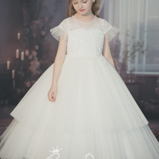This white gown redefines royal elegance with premium materials and masterful craftsmanship. The satin bodice is adorned with pearl-embellished lace embroideries in a enveloping design that flatters the figure. The dramatic draped sleeves feature pleated tulle ruffles at the cuffs, perfectly echoing the skirt's design.