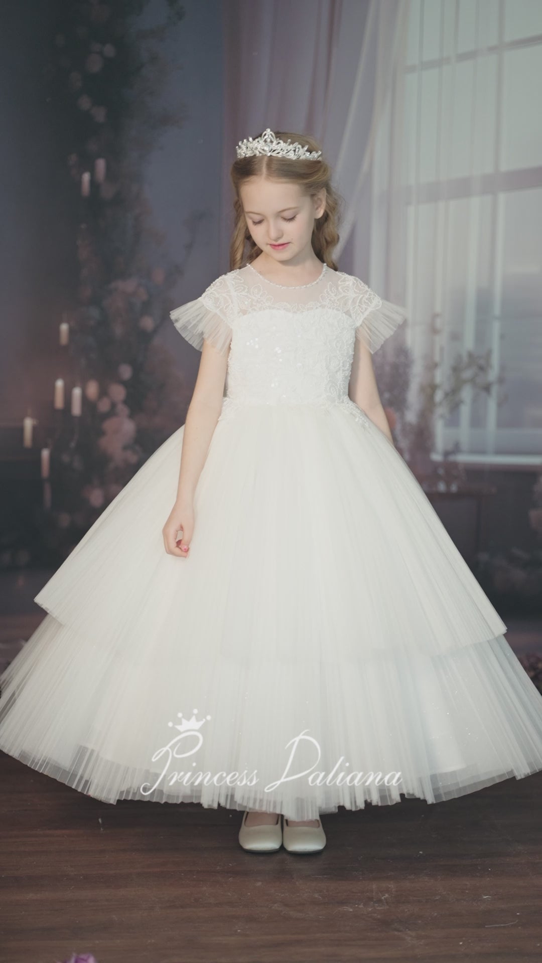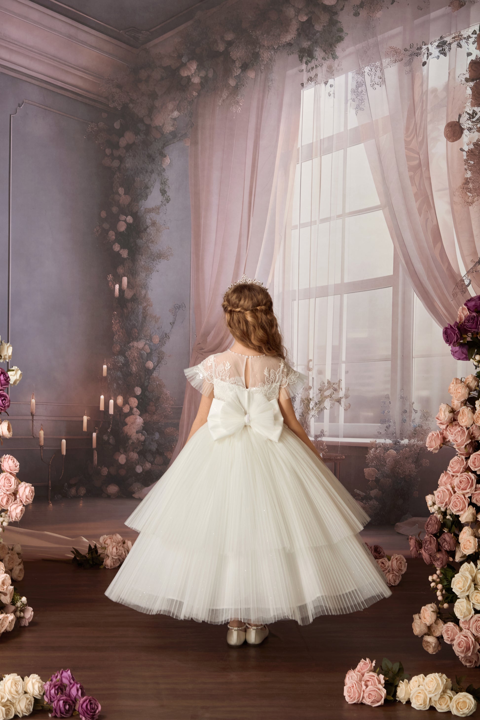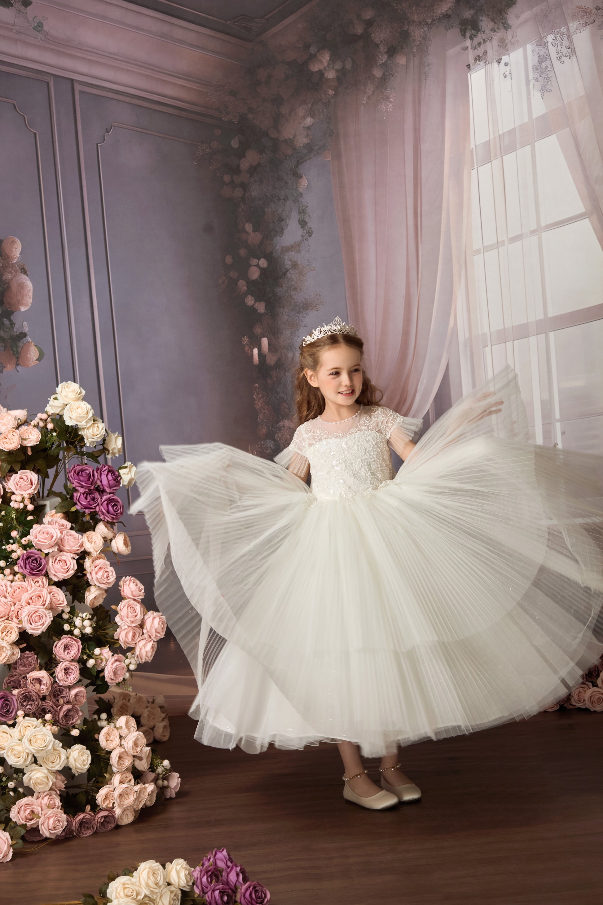 The skirt showcases an architectural silhouette built through layered stiff pleated tulle, with each fold precision-calculated to create a fluttering butterfly-wing effect when in motion. The coordinated movement of pleated tulle at both sleeves and skirt generates a captivating dance of elegance, blending the grace of a ballerina with the ethereal beauty of butterflies in flight.